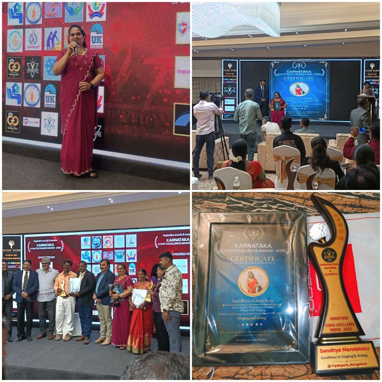 ವಿವಿಧ ಕ್ಷೇತ್ರದ ಸಾಧನೆಗಾಗಿ ಬೆಂಗಳೂರಿನ ಐಕಾನಿಕ್ ಸಂಸ್ಥೆಯವರು ಅವಾರ್ಡ್ ನೀಡುತ್ತಿದ್ದು, ಭಜನೆ, ಯಕ್ಷಗಾನ, ಭಾವಗೀತೆ ಕ್ಷೇತ್ರದ ಸಾಧನೆಗಾಗಿ ಸಂಧ್ಯಾ ಮಂಡೆಕೋಲುರಿಗೆ ಅವಾರ್ಡ್ ನೀಡಲಾಗಿದೆ.