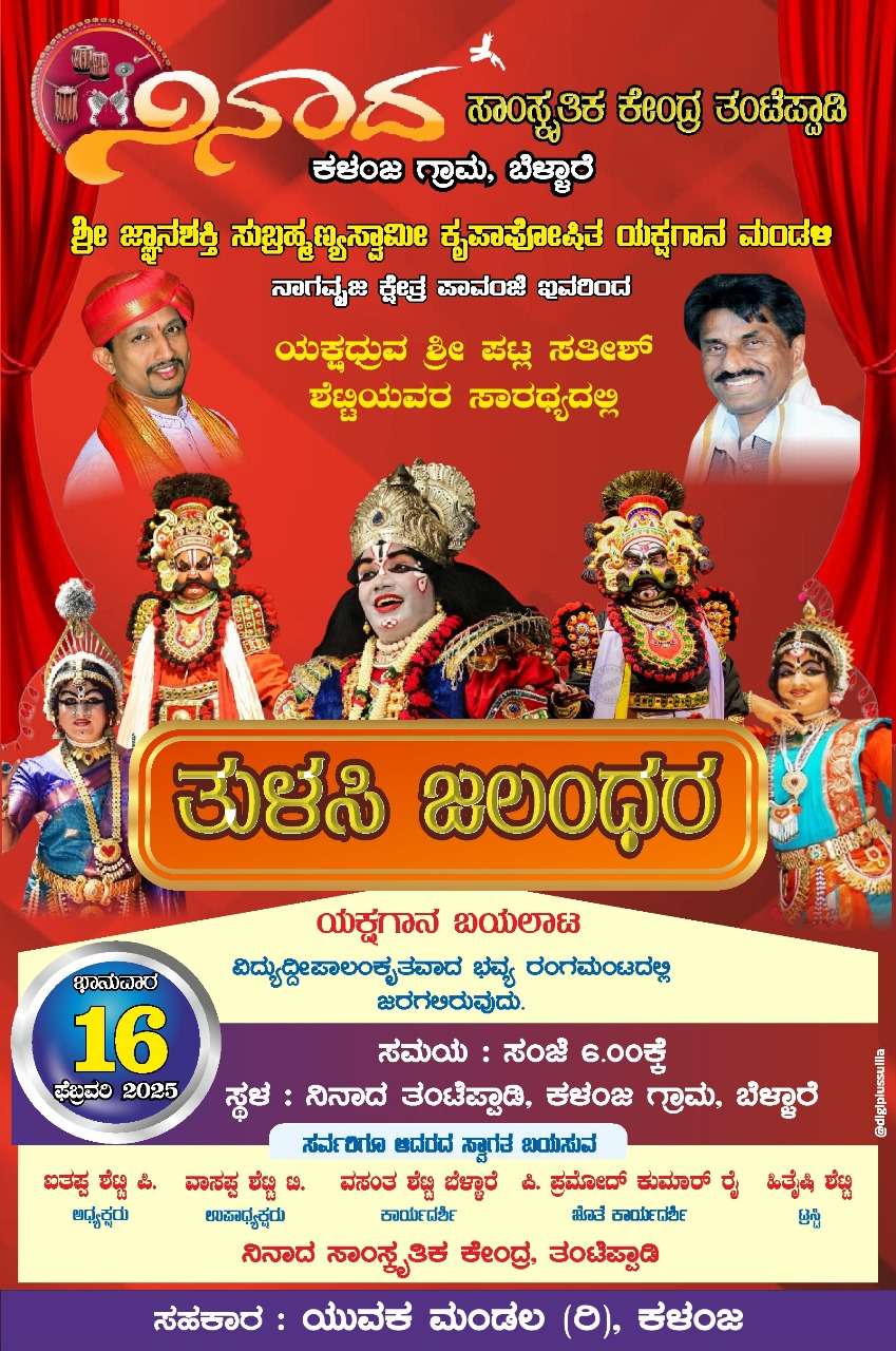ವಸಂತ ಶೆಟ್ಟಿ ಬೆಳ್ಳಾರೆ ಅವರ ಸಾರಥ್ಯದ ನಿನಾದ ಸಾಂಸ್ಕೃತಿಕ ಕೇಂದ್ರ ತಂಟೆಪ್ಪಾಡಿ ಇಲ್ಲಿ ಪಟ್ಲ ಸತೀಶ್ ಶೆಟ್ಟಿ ಸಾರಥ್ಯದ ಶ್ರೀ ಜ್ಞಾನಶಕ್ತಿ ಸುಬ್ರಹ್ಮಣ್ಯ ಸ್ವಾಮಿ ಕೃಪಾಪೋಷಿತ ಯಕ್ಷಗಾನ ಮಂಡಳಿ ನಾಗವೃಜ ಕ್ಷೇತ್ರ ಪಾವಂಜೆ ಇವರು “ತುಳಸಿ ಜಲಂಧರ” ಎಂಬ ಯಕ್ಷಗಾನ ಫೆ.16 ರಂದು ಪ್ರದರ್ಶನ ವಾಗಲಿದೆ.