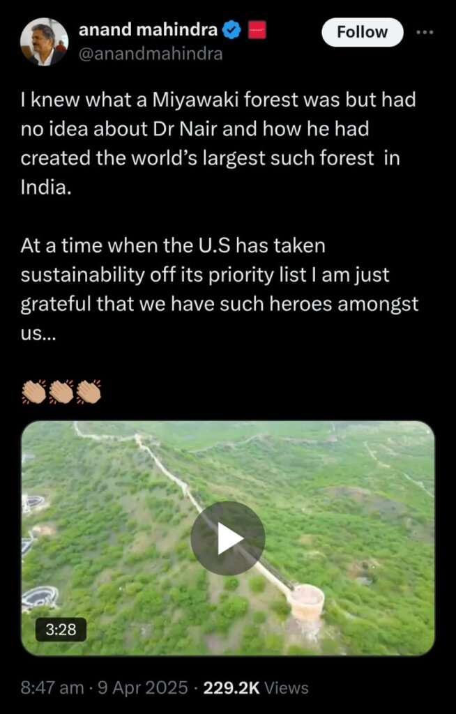 ” ಮಿಯಾವಾಕಿ ಅರಣ್ಯ ಎಂದರೇನು ಎಂದು ನನಗೆ ತಿಳಿದಿತ್ತು, ಆದರೆ ಡಾ. ನಾಯರ್ ಅವರ ಬಗ್ಗೆ ಮತ್ತು ಅವರು ಭಾರತದಲ್ಲಿ ವಿಶ್ವದ ಅತಿದೊಡ್ಡ ಅರಣ್ಯವನ್ನು ಹೇಗೆ ರಚಿಸಿದರು ಎಂಬುದರ ಬಗ್ಗೆ ನನಗೆ ತಿಳಿದಿರಲಿಲ್ಲ. ಅಮೆರಿಕವು ಸುಸ್ಥಿರತೆಯನ್ನು ತನ್ನ ಆದ್ಯತೆಯ ಪಟ್ಟಿಯಿಂದ ತೆಗೆದುಹಾಕಿರುವ ಸಮಯದಲ್ಲಿ, ನಮ್ಮ ನಡುವೆ ಅಂತಹ ವೀರರಿದ್ದಾರೆ ಎಂದು ನಾನು ಕೃತಜ್ಞನಾಗಿದ್ದೇನೆ.” ಎಂಬರ್ಥದಲ್ಲಿ ಆನಂದ್ ಮಹೀಂದ್ರ ಬರೆದುಕೊಂಡಿದ್ದಾರೆ.