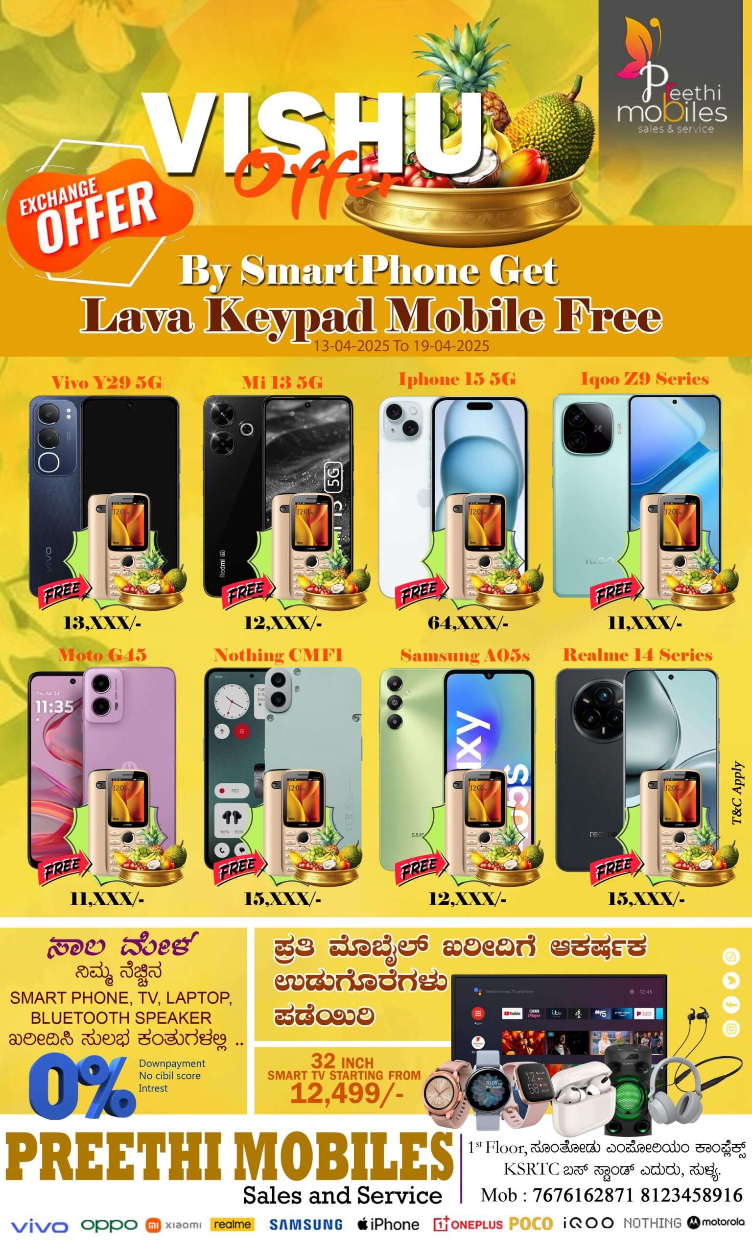 ಸುಳ್ಯದ ಕೆಎಸ್ಆರ್ಟಿಸಿ ಬಸ್ ನಿಲ್ದಾಣ ಮುಂಭಾಗದ ಸೂಂತೋಡು ಎಂಪೋರಿಯ೦ನಲ್ಲಿರುವ ಪ್ರೀತಿ ಮೊಬೈಲ್ಸ್ ನಲ್ಲಿ ವಿಶು ಹಬ್ಬದ ಪ್ರಯುಕ್ತ ಗ್ರಾಹಕರಿಗೆ ವಿಶೇಷ ಆಫರ್ ದೊರೆಯಲಿದೆ.
