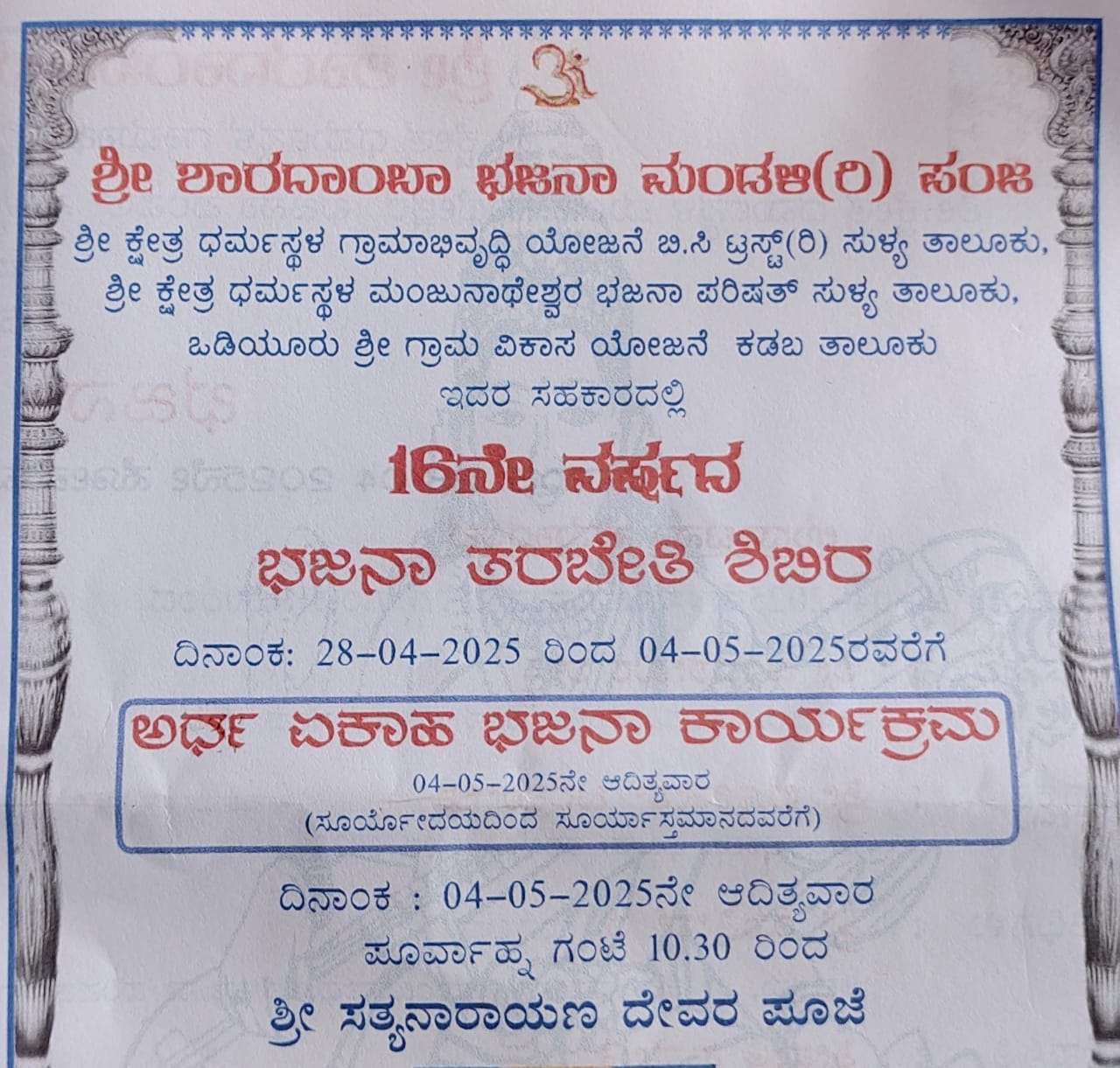16ನೇ ವರ್ಷದ ಭಜನಾ ತರಬೇತಿ ಶಿಬಿರ,ಎ. 28ರಿಂದ ಮೇ.4 ತನಕ ನಡೆಯಲಿದೆ. ಮೇ.4 ರಂದು ಅರ್ಧ ಏಕಾಹ ಭಜನಾ ಕಾರ್ಯಕ್ರಮ (ಸೂರ್ಯೋದಯದಿಂದ ಸೂರ್ಯಾಸ್ತಮಾನದವರೆಗೆ) ಪಂಜ ಶ್ರೀ ಶಾರದಾಂಬಾ ಭಜನಾ ಮಂದಿರದಲ್ಲಿ ನಡೆಯಲಿದೆ.
