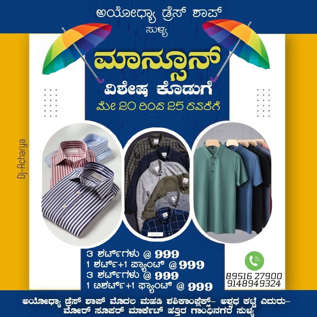 ಸುಳ್ಯ ಗಾಂಧಿನಗರದ ಅಶ್ವಥ ಕಟ್ಟೆ ಎದುರಿನ ಶಶಿ ಕಾಂಪ್ಲೆಕ್ಸ್‌ನಲ್ಲಿರುವ ಅಯೋಧ್ಯಾ ಡ್ರೆಸ್‌ಶಾಪ್‌ನಲ್ಲಿ ಮಾನ್ಸೂನ್ ಸ್ಪೆಷಲ್ ಆಫರ್ ಆರಂಭಗೊಂಡಿದೆ. ಮೂರು ಶರ್ಟ್‌ಗಳು ರೂ. 999 ಕ್ಕೆ ಲಭ್ಯವಿದ್ದು, ಒಂದು ಪ್ಯಾಂಟ್ ಮತ್ತು ಒಂದು ಶರ್ಟ್‌ಗೂ 999 ಕ್ಕೆ ದೊರೆಯಲಿದೆ.