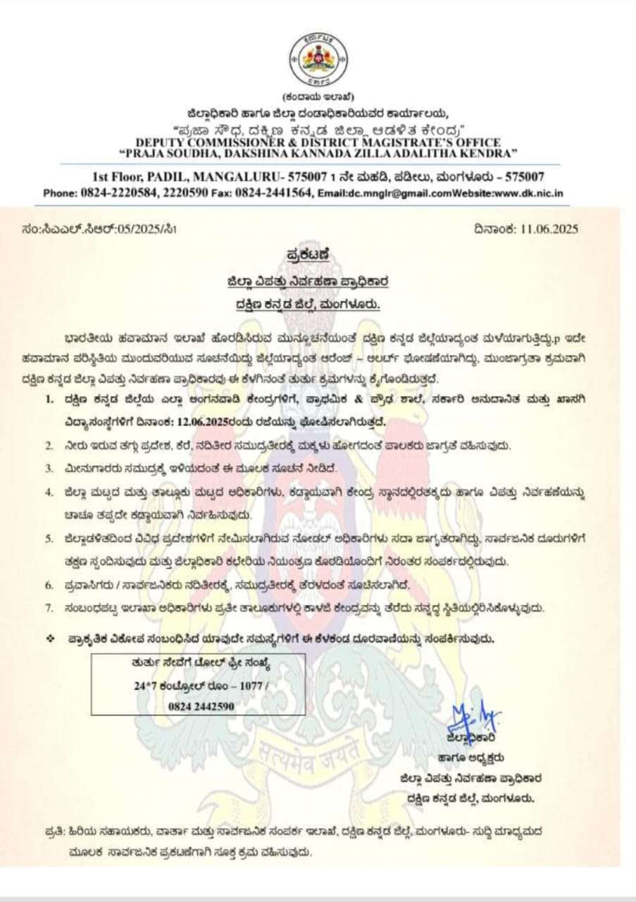 ಕರಾವಳಿ ಭಾಗದಲ್ಲಿ ಸುರಿಯುತ್ತಿರುವ ಧಾರಾಕಾರ ಮಳೆಯ ಹಿನ್ನಲೆಯಲ್ಲಿ ದಕ್ಷಿಣ ಕನ್ನಡ ಜಿಲ್ಲೆಯ ಅಂಗನವಾಡಿ, ಪ್ರಾಥಮಿಕ, ಪ್ರೌಢಶಾಲೆಗಳಿಗೆ ಜೂನ್ 12ರಂದು ರಜೆ ಘೋಷಣೆ ಮಾಡಲಾಗಿದೆ.
