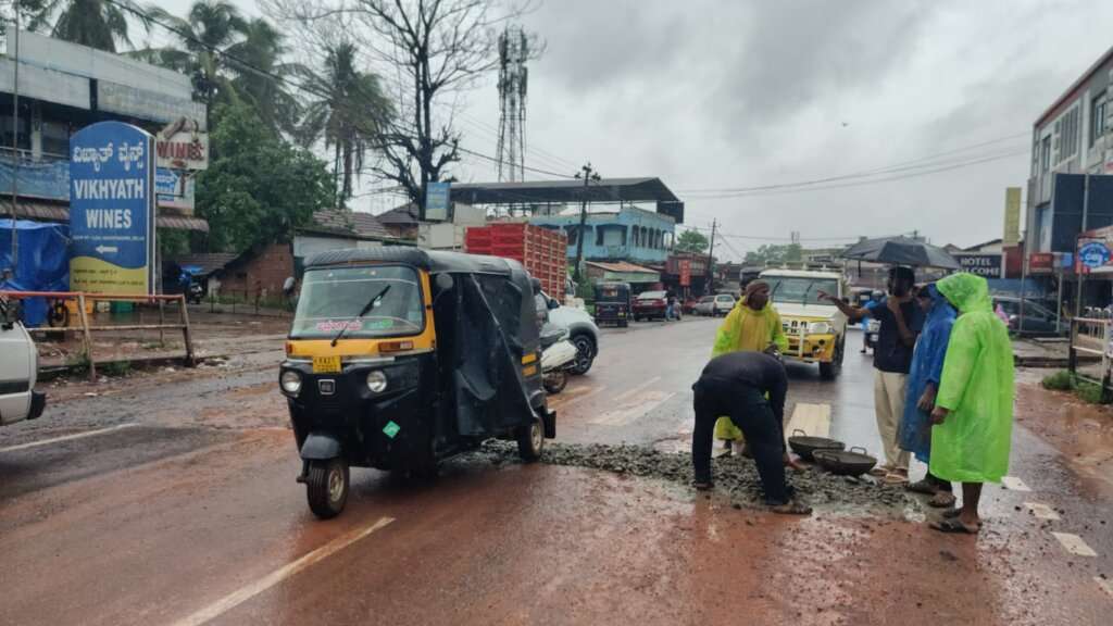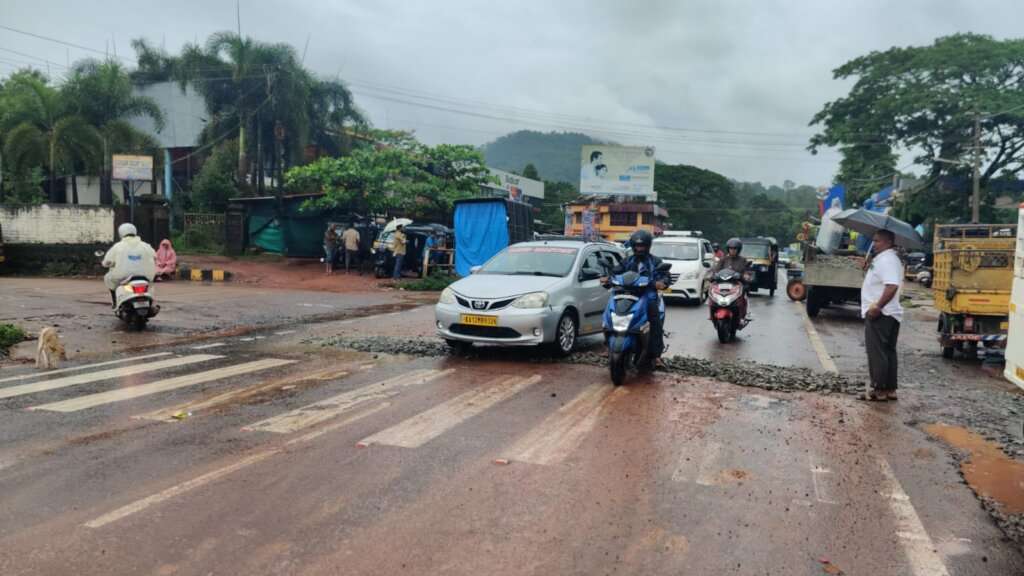 ಮುಚ್ಚಿ ಕಾಂಕ್ರೀಟ್ ಮಾಡದಿರುವುದರಿಂದ ಮಳೆ ಬಂದು ಹೊಂಡದಲ್ಲಿ ನೀರು ನಿಂತು ವಾಹನ ಸವಾರರಿಗೆ ಸಂಕಷ್ಟವಾಗಿತ್ತು.