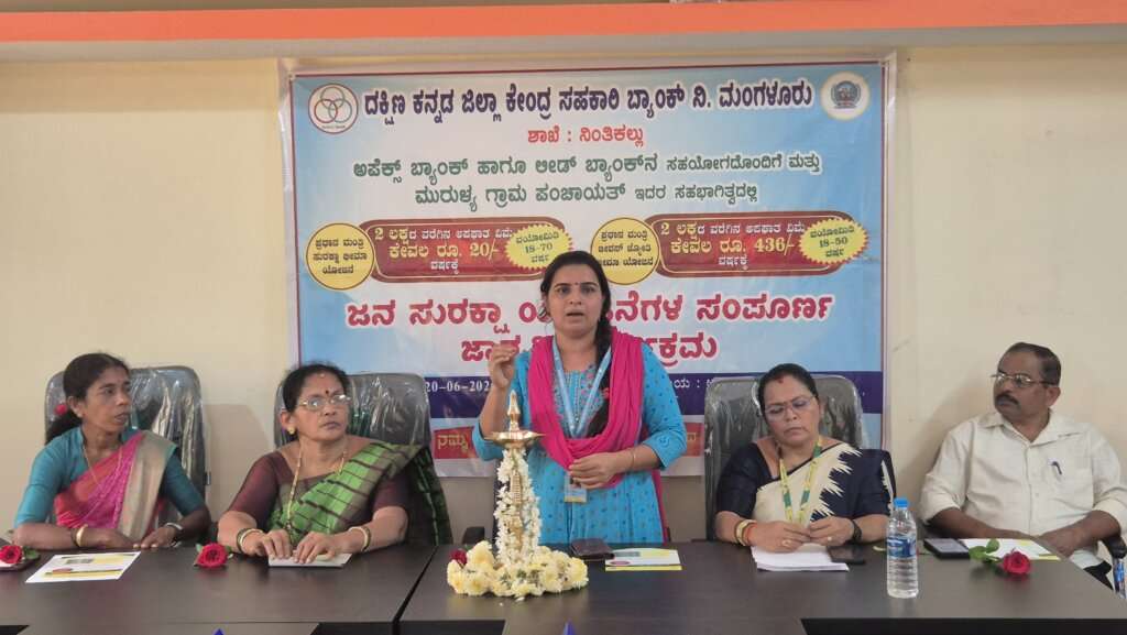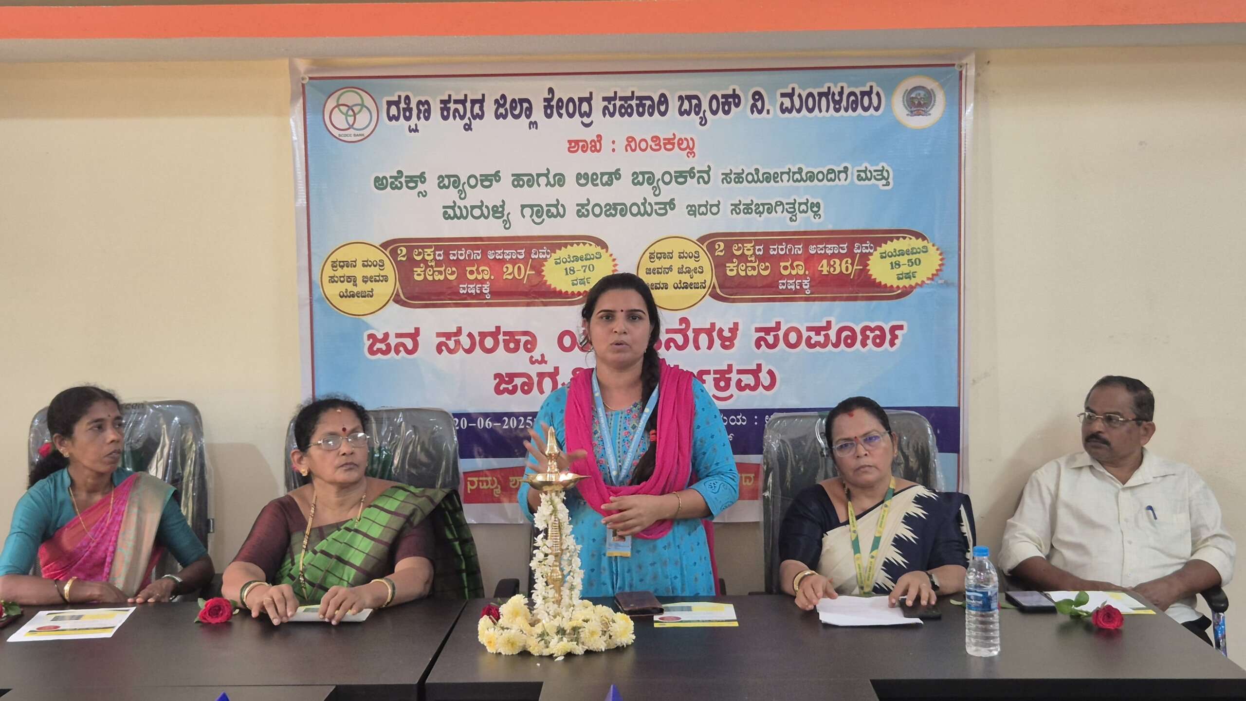 ದಕ್ಷಿಣ ಕನ್ನಡ ಜಿಲ್ಲಾ ಕೇಂದ್ರ ಸಹಕಾರಿ ಬ್ಯಾಂಕ್ ಮಂಗಳೂರು, ನಿಂತಿಕಲ್ಲು ಶಾಖೆ ಅಪೇಕ್ಷಾ ಬ್ಯಾಂಕ್ ಹಾಗೂ ಲೀಡ್ ಬ್ಯಾಂಕ್ ಗಳ ಸಹಯೋಗಗಳೊಂದಿಗೆ ಮುರುಳ್ಯ ಗ್ರಾಮ ಪಂಚಾಯತ್ ಅಧ್ಯಕ್ಷೆ ಶ್ರೀಮತಿ ವನಿತಾ ಸುವರ್ಣರವರ ಅಧ್ಯಕ್ಷತೆಯಲ್ಲಿ ಜೂನ್ ೨೦ ರಂದು ಪಂಚಾಯತ್ ಸಭಾಂಗಣದಲ್ಲಿ ಜನ ಸುರಕ್ಷಾ ಯೋಜನೆಗಳ ಸಂಪೂರ್ಣ ಜಾಗೃತಿ ಕಾರ್ಯಕ್ರಮ ನಡೆಯಿತು, ವನಿತಾ ಸುವರ್ಣರು ದೀಪ ಬೆಳಗಿಸಿ ಉದ್ಘಾಟಿಸಿ ಶುಭಾ ಹಾರೈಸಿದರು.