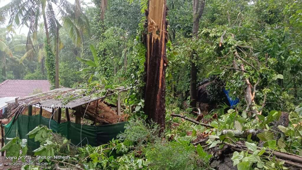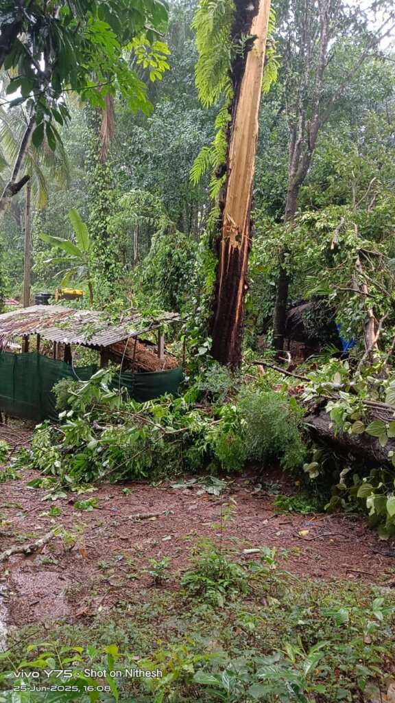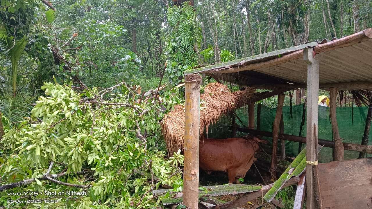 ಇಂದು ಸಂಜೆ ಸುರಿದ ಮಳೆಗೆ ಮರವೊಂದು ದನದ ಹಟ್ಟಿಯ ಮೇಲೆ ಮುರಿದು ಬಿದ್ದು ಹಟ್ಟಿ ಸಂಪೂರ್ಣ ಹಾನಿಗೊಂಡ ಘಟನೆ ವರದಿಯಾಗಿದೆ.