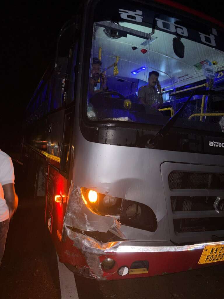ಮೈಸೂರು ನಿಂದ ಮಂಗಳೂರು ಹೋಗುತ್ತಿದ್ದ ಬಸ್ಸು ಮತ್ತು ಮಂಗಳೂರು ನಿಂದ ಬೆಂಗಳೂರು ಕಡೆ ಹೋಗುತ್ತಿದ್ದ ಕಾರು ಪರಸ್ಪರ ಡಿಕ್ಕಿ ಆಗಿದ್ದು ಘಟನೆಯಿಂದ ಕಾರು ಹಾಗೂ ಬಸ್ಸಿನ ಮುಂಭಾಗ ಜಖಂ ಗೊಂಡಿದೆ.