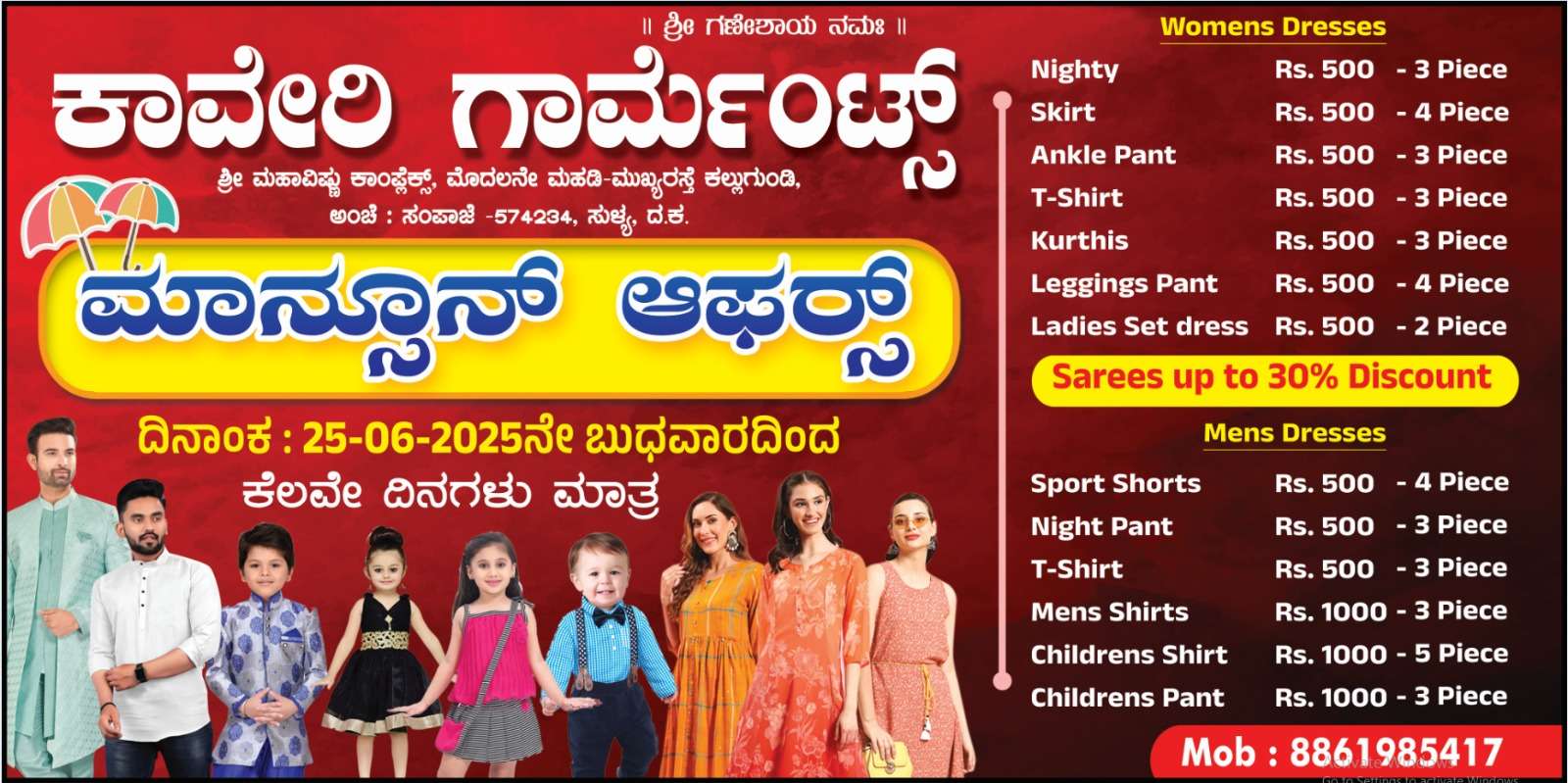 ಕಲ್ಲುಗುಂಡಿ ಶ್ರೀ ಮಹಾವಿಷ್ಣು ಕಾಂಪ್ಲೆಕ್ಸ್ ನಲ್ಲಿ ರುವ ಕಾವೇರಿ ಗಾರ್ಮೆಂಟ್ಸ್ ನಲ್ಲಿ ಮಾನ್ಸೂನ್ ವಿಶೇಷ ಆಫರ್ ಆರಂಭಗೊಂಡಿದೆ.