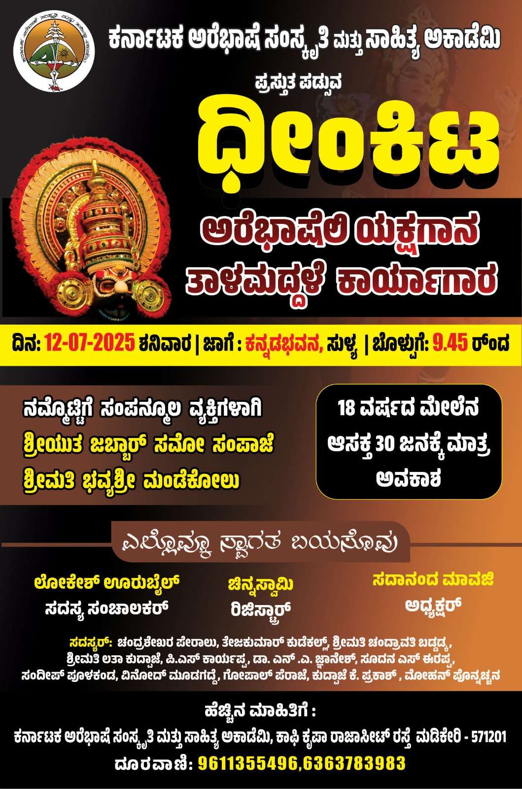 ಕರ್ನಾಟಕ ಅರೆಭಾಷೆ ಸಂಸ್ಕೃತಿ ಮತ್ತು ಸಾಹಿತ್ಯ ಅಕಾಡೆಮಿ ವತಿಯಿಂದ ಅರೆಭಾಷೆಯಲ್ಲಿ ಯಕ್ಷಗಾನ ತಾಳಮದ್ದಳೆ ಕಾರ್ಯಾಗಾರ ಜು. 12 ರಂದು ನಡೆಯಲಿದೆ.