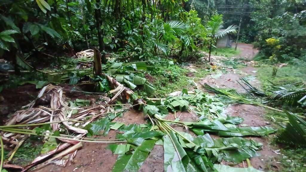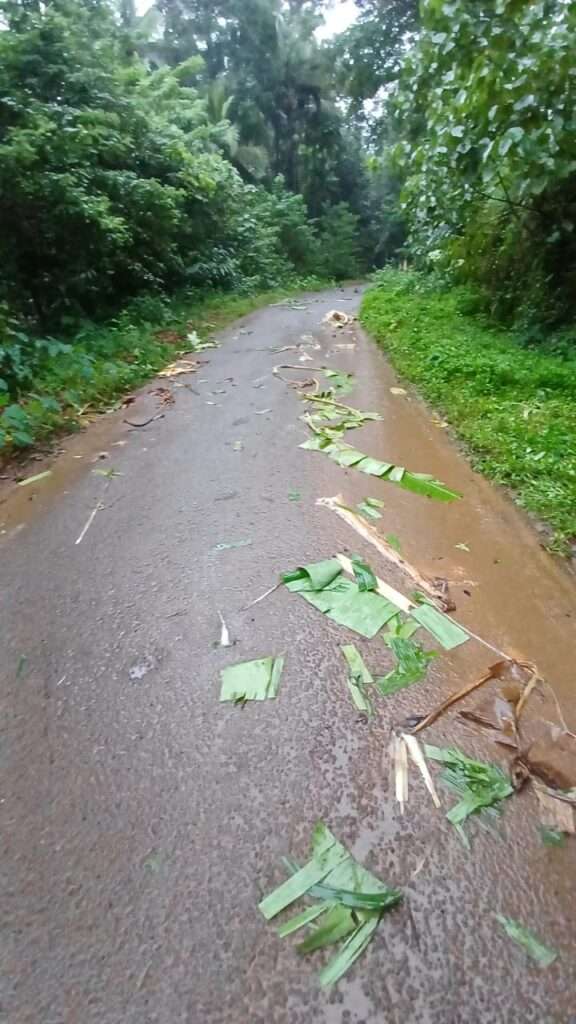 ರಸ್ತೆಯಲ್ಲಿ ಬಾಳೆ -ತೆಂಗಿನ ಗರಿಗಳು ಚೆಲ್ಲಾಪಿಲ್ಲಿ – ಸಾರ್ವಜನಿಕರಲ್ಲಿ ಭಯ-ಆತಂಕ
