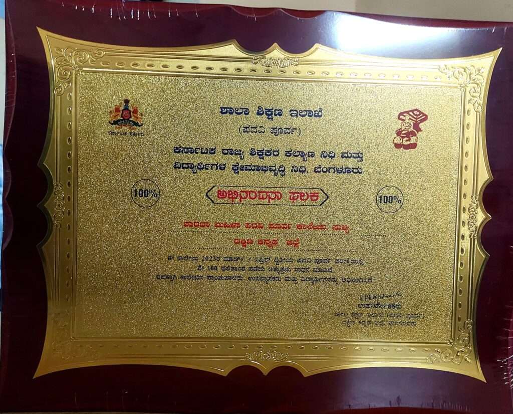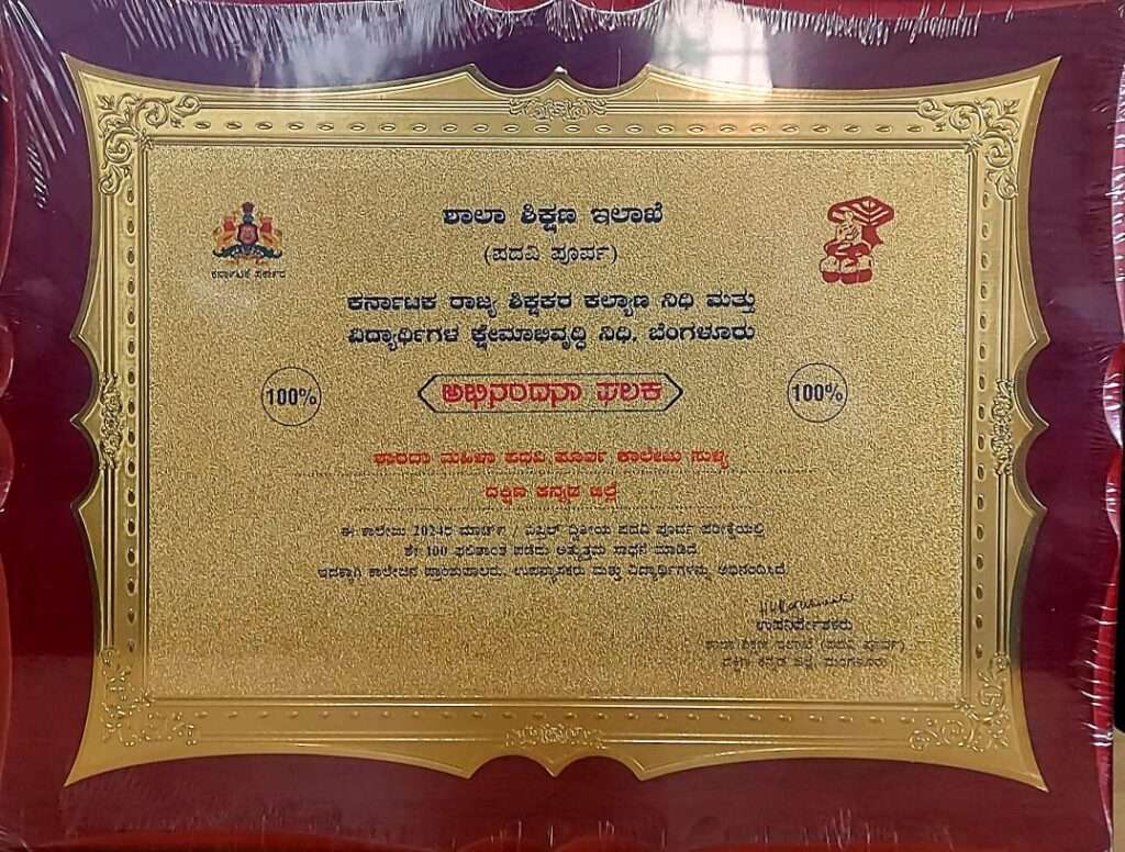ಶಾಲಾ ಶಿಕ್ಷಣ ಇಲಾಖೆ ಪದವಿ ಪೂರ್ವ ದಕ್ಷಿಣ ಕನ್ನಡ ಜಿಲ್ಲೆ, ಕರ್ನಾಟಕ ರಾಜ್ಯ ಶಿಕ್ಷಕರ ಕಲ್ಯಾಣ ನಿಧಿ ಮತ್ತು ವಿದ್ಯಾರ್ಥಿಗಳ ಕ್ಷೇಮಾಭಿವೃದ್ಧಿ ನಿಧಿ, ಬೆಂಗಳೂರು ಹಾಗೂ ದಕ್ಷಿಣ ಕನ್ನಡ ಜಿಲ್ಲಾ ಪದವಿ ಪೂರ್ವ ಕಾಲೇಜುಗಳ ಪ್ರಾಚಾರ್ಯರ ಸಂಘ( ರಿ) ಇವರ ಸಹಯೋಗದಲ್ಲಿ 2023 ಮತ್ತು 2024ರ ದ್ವಿತೀಯ ಪಿಯುಸಿ ಪರೀಕ್ಷೆಯಲ್ಲಿ ಶೇಕಡ 100 ಫಲಿತಾಂಶ ಪಡೆದ ಪದವಿ ಪೂರ್ವ ಕಾಲೇಜುಗಳಿಗೆ ಗೌರವ ಸಮರ್ಪಣೆ ಹಾಗೂ ವಿದ್ಯಾರ್ಥಿಗಳಿಗೆ ಪ್ರತಿಭಾ ಪುರಸ್ಕಾರ ಕಾರ್ಯಕ್ರಮ ಪ್ರೆಸ್ಟೀಜ್ ಪದವಿ ಪೂರ್ವ ಕಾಲೇಜು, ಜಪ್ಪಿನಮೊಗರು, ಮಂಗಳೂರು ಇಲ್ಲಿ ನಡೆಯಿತು. ಸುಳ್ಯದ ಶ್ರೀ ಶಾರದಾ ಪದವಿ ಪೂರ್ವ ಕಾಲೇಜು 2023 ಮತ್ತು 2024ರಲ್ಲಿ ಶೇಕಡ 100 ಫಲಿತಾಂಶವನ್ನು ಪಡೆದಿದ್ದು ಸಂಸ್ಥೆಯ ಪ್ರಭಾರ ಪ್ರಾಂಶುಪಾಲರಾದ ಶ್ರೀಮತಿ ಸ್ವರ್ಣಕಲಾ .ಎ .ಎಸ್ ರವರು ವಿಧಾನ ಪರಿಷತ್ ಸದಸ್ಯರಾದ ಭೋಜೇಗೌಡ ರವರಿಂದ ಅಭಿನಂದನಾ ಫಲಕವನ್ನು ಸ್ವೀಕರಿಸಿದರು.