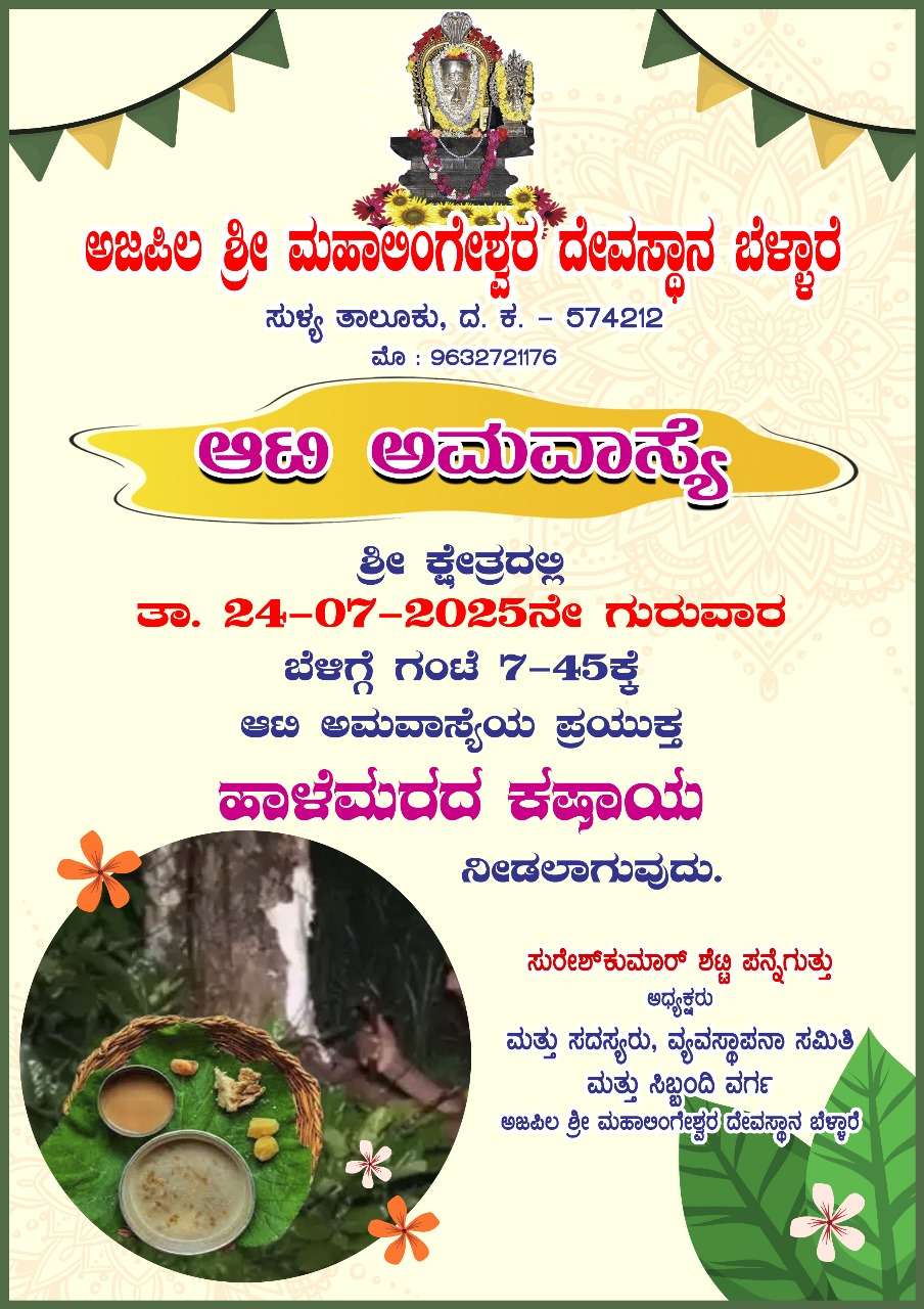 ಆಟಿ ಅಮಾವಾಸ್ಯೆ ಪ್ರಯುಕ್ತ ಬೆಳ್ಳಾರೆ ಅಜಪಿಲ ಶ್ರೀ ಮಹಾಲಿಂಗೇಶ್ವರ ದೇವಸ್ಥಾನದಲ್ಲಿ ನಾಳೆ ಜು.24 ರಂದು ಮುಂಜಾನೆ ಶ್ರೀ ದೇವರಿಗೆ ಪೂಜೆ ನಡೆದ ಬಳಿಕ ಭಕ್ತರಿಗೆ ವಿಶೇಷ ತೀರ್ಥವಾಗಿ ಹಾಲೆ ಮರದ ಕಷಾಯ ವಿತರಣೆ ನಡೆಯಲಿದೆ. ಎಂದು ದೇವಳದ ವ್ಯವಸ್ಥಾಪನಾ ಸಮಿತಿ ಅಧ್ಯಕ್ಷ ಸುರೇಶ್ ಕುಮಾರ್ ಶೆಟ್ಟಿ ಪನ್ನೆಗುತ್ತು ತಿಳಿಸಿದ್ದಾರೆ.