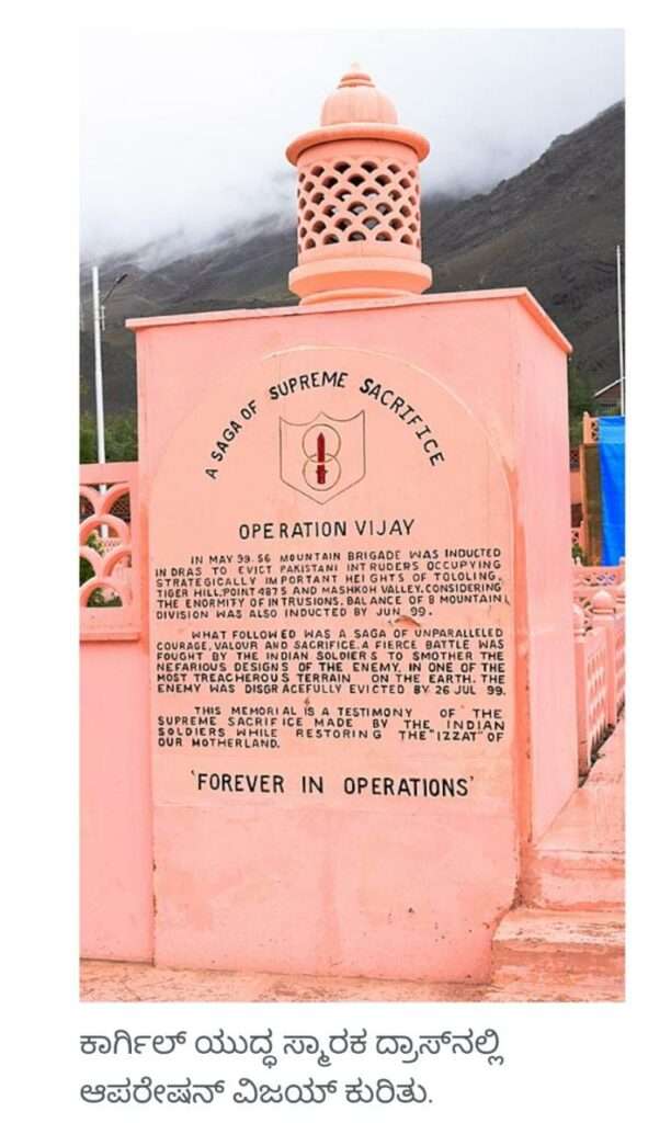 “ಆಪರೇಷನ್ ವಿಜಯ” ಎಂಬುದಾಗಿ ಹೆಸರಿಸಿತು. ಭಾರತದ ಭೂ ಸೇನೆ, ವಾಯು ಸೇನೆಯ ನೆರವಿನಿಂದ ಪಾಪಿ ಪಾಕಿಸ್ತಾನದ ನುಸುಳು ಕೋರರನ್ನು ಹೊಸಕಿಹಾಕಿ, ಹೊರದಬ್ಬಿ ಪಾಕ್ ಆಕ್ರಮಿತ ಕಾರ್ಗಿಲ್ ಪ್ರದೇಶವನ್ನು ಮಗದೊಮ್ಮೆ ತನ್ನ ತೆಕ್ಕೆಗೆ ಸೇರಿಸಿಕೊಂಡ ಸ್ಮರಣೀಯ ಯುದ್ಧ ಇದಾಗಿದೆ