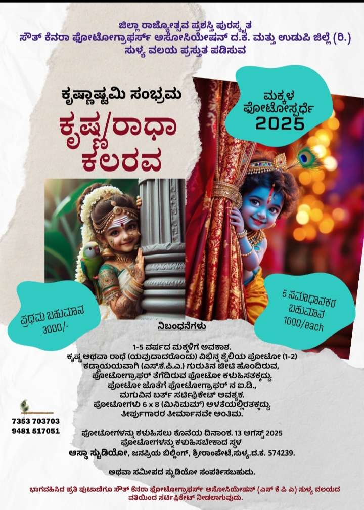 ಜಿಲ್ಲಾ ರಾಜ್ಯೋತ್ಸವ ಪ್ರಶಸ್ತಿ ಪುರಸ್ಕೃತ ಸೌತ್ ಕೆನರಾ ಫೋಟೋಗ್ರಾಫರ್ಸ್ ಅಸೋಸಿಯೇಷನ್ ದ ಕ ಮತ್ತು ಉಡುಪಿ ಜಿಲ್ಲೆ {ರಿ.}, ಸುಳ್ಯ ವಲಯ ಪ್ರಸ್ತುತಪಡಿಸುವ ಕೃಷ್ಣಾಷ್ಟಮಿ ಸಂಭ್ರಮದ ಮಕ್ಕಳ ಫೋಟೋಸ್ಪರ್ಧೆ 2025 ” ಕೃಷ್ಣ /ರಾಧಾ ಕಲರವ” ಇದರ ಪೋಸ್ಟರ್ ಅನ್ನು ಸುಳ್ಯದ ಆಸ್ತಾ ಸ್ಟುಡಿಯೋದಲ್ಲಿ ಬಿಡುಗಡೆಗೊಳಿಸಲಾಯಿತು.