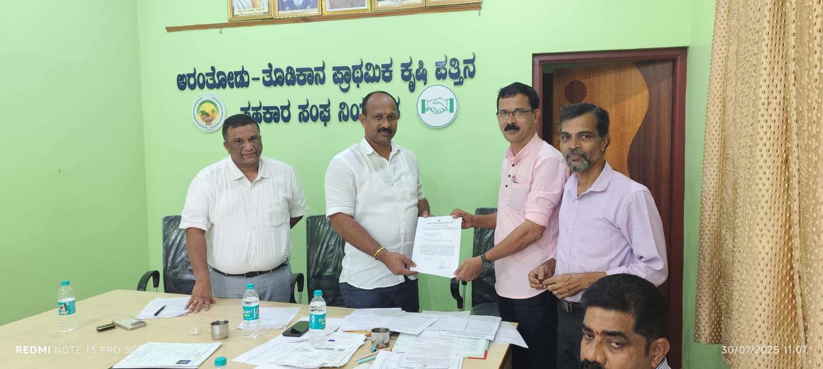 ಜುಲೈ 9ರಂದು ಭೀಕರ ಅಗ್ನಿ ದುರಂತ ತುತ್ತಾದ ರಾಜ್ಯಕ್ಕೆ ಮಾದರಿಯಾಗಿ ಕಾರ್ಯನಿರ್ವಹಿಸುತ್ತಿದ್ದ ಆರಂತೋಡು ಗ್ರಾಮ ಪಂಚಾಯತ್ ನ ಘನ ತ್ಯಾಜ್ಯ ವಿಲೇವಾರಿ ಘಟಕ ( ಸ್ವಚ್ಛ ಸಂಕೀರ್ಣ )ದ ಪುನರ್ ನಿರ್ಮಾಣಕಾಗಿ ಆರಂತೋಡು ಗ್ರಾಮ ಪಂಚಾಯತ್ ಅಧ್ಯಕ್ಷರು, ಸದಸ್ಯರು ಆರಂತೋಡು -ತೊಡಿಕಾನ ಕೃಷಿ ಪತ್ತಿನ ಸಹಕಾರಿ ಸಂಘದ ಆಡಳಿತ ಸಮಿತಿ ಸಭೆಯಲ್ಲಿ,ಸಂಘ ದ ಉಪಾಧ್ಯಕ್ಷರು, ಆಡಳಿತ ಸಮಿತಿ ಸದಸ್ಯರು ಮತ್ತು ಮುಖ್ಯ ಕಾರ್ಯನಿರ್ವಾಣಾಧಿಕಾರಿಗಳ ಉಪಸ್ಥಿತಿಯಲ್ಲಿ ಸಂಘದ ಅಧ್ಯಕ್ಷರಾದ ಶ್ರೀ ಸಂತೋಷ ಕುತ್ತಮೊಟ್ಟೆ ಯವರಿಗೆ ಸಹಾಯ ಹಸ್ತಕ್ಕಾಗಿ ಜುಲೈ 29 ದಂದು ಮನವಿ ಸಲ್ಲಿಸಿದರು
