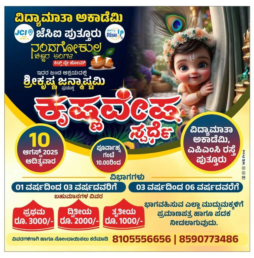 ಸ್ಪರ್ಧಾತ್ಮಕ ಪರೀಕ್ಷೆಗಳ ತರಬೇತಿ ಕೇಂದ್ರವಾಗಿರುವ ವಿದ್ಯಾಮಾತಾ ಅಕಾಡೆಮಿ, ಜೆಸಿಐ ಪುತ್ತೂರು ಹಾಗೂ ಚಿಣ್ಣರ ಅಂಗಳ ಪುತ್ತೂರು ಇದರ ಸಂಯುಕ್ತ ಆಶ್ರಯದಲ್ಲಿ ವಿದ್ಯಾಮಾತಾ ಅಕಾಡೆಮಿ ಪುತ್ತೂರು ಇಲ್ಲಿ ದಿನಾಂಕ 10.08.2025 ಆದಿತ್ಯವಾರದಂದು ಬೆಳಿಗ್ಗೆ 10 ಗಂಟೆಯಿಂದ ಕೃಷ್ಣ ವೇಷ ಸ್ಪರ್ಧೆ ನಡೆಯಲಿದ್ದು, ಸ್ಪರ್ಧೆಯು ಎರಡು ವಿಭಾಗದಲ್ಲಿ ನಡೆಯಲಿದ್ದು, 01ವರ್ಷದಿಂದ 03ವರ್ಷದೊಳಗಿನ ಮಕ್ಕಳು ಹಾಗೂ 03ವರ್ಷದಿಂದ 06ವರ್ಷದೊಳಗಿನ ಮಕ್ಕಳಿಗೆ ಸ್ಪರ್ಧೆ ಆಯೋಜನೆಗೊಂಡಿದೆ.