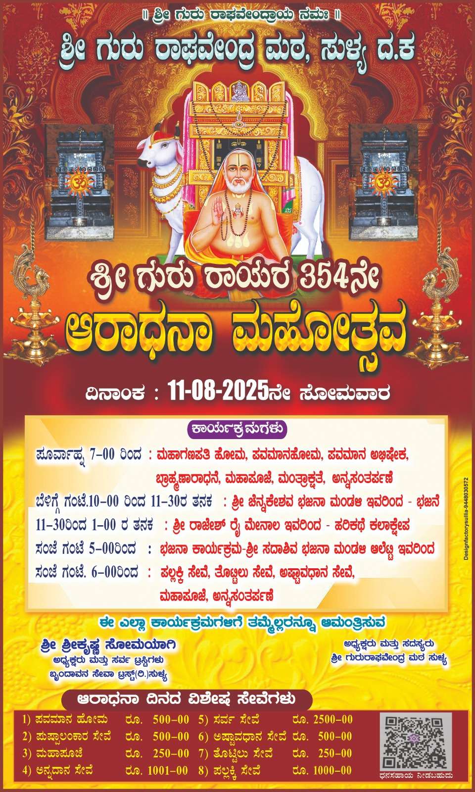 ಸುಳ್ಯದ ಶ್ರೀ ಗುರುರಾಘವೇಂದ್ರ ಮಠದಲ್ಲಿ ಶ್ರೀ ಗುರು ರಾಯರ 354ನೇ ಆರಾಧನಾ ಮಹೋತ್ಸವವು
