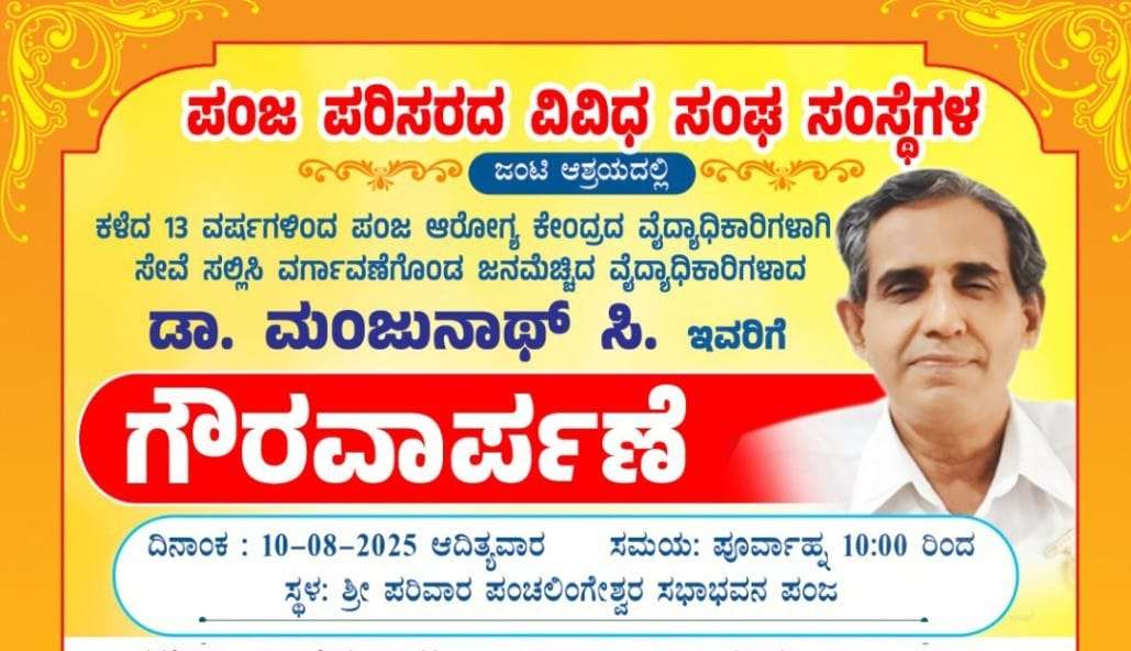 ಕಳೆದ 13 ವರ್ಷಗಳಿಂದ ಪಂಜ ಆರೋಗ್ಯ ಕೇಂದ್ರದಲ್ಲಿ ವೈದ್ಯಾಧಿಕಾರಿಯಾಗಿ ಸೇವೆ ಸಲ್ಲಿಸಿ ವರ್ಗಾವಣೆಗೊಂಡ ವೈದ್ಯಾಧಿಕಾರಿ ಡಾ.ಮಂಜುನಾಥ್ ಸಿ ರವರಿಗೆ ಗೌರವಾರ್ಪಣೆ ಕಾರ್ಯಕ್ರಮ ನಾಳೆ ಆ.10ರಂದು ಪೂ.10ರಿಂದ ಪಂಜ ಶ್ರೀ ಪರಿವಾರ ಪಂಚಲಿಂಗೇಶ್ವರ ದೇವಸ್ಥಾನದ ಸಭಾಭವನದಲ್ಲಿ ನಡೆಯಲಿದೆ. ಪಂಜ ಪರಿಸರದ ವಿವಿಧ ಸಂಘ ಸಂಸ್ಥೆಗಳ ಸಂಯುಕ್ತ ಆಶ್ರಯದಲ್ಲಿ ನಡೆಯಲಿದೆ.ಕಾರ್ಯಕ್ರಮದ