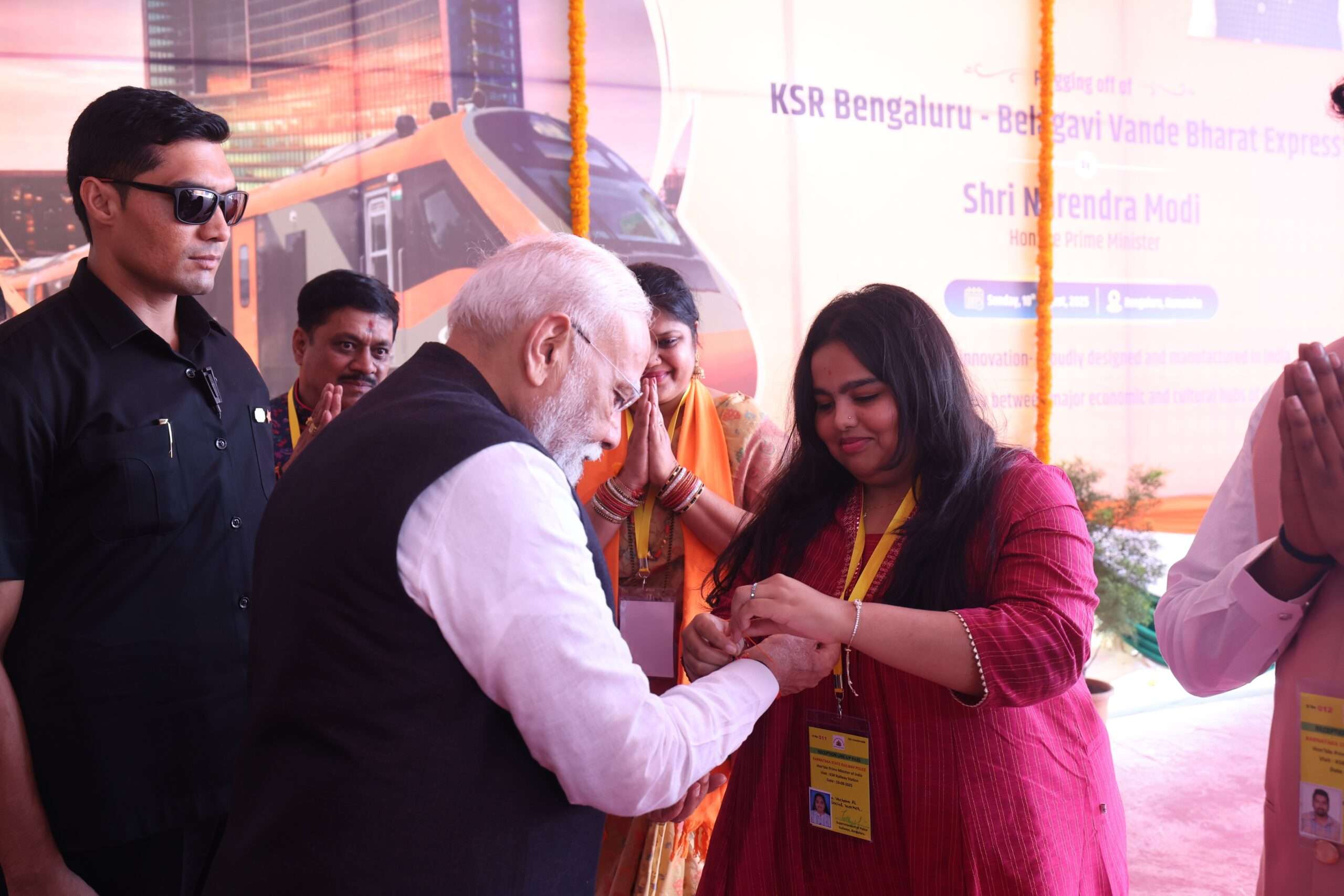 ಪ್ರಧಾನ ಮಂತ್ರಿ ನರೇಂದ್ರ ಮೋದಿಯವರು ಆ.10 ರಂದು ವಂದೇ ಭಾರತ್ ರೈಲುಗಳ ಉದ್ಘಾಟನೆ ಮತ್ತು ಬೆಂಗಳೂರಿನ ಜಯನಗರದಿಂದ ಎಲೆಕ್ಟ್ರಾನಿಕ್ ಸಿಟಿಯ ವರೆಗಿನ ಹಳದಿ ಮಾರ್ಗ ಮೆಟ್ರೋ ರೈಲಿನ ಉದ್ಘಾಟನೆಗೆಂದು ಬೆಂಗಳೂರಿಗೆ ಬಂದ ಸಂದರ್ಭದಲ್ಲಿ ಕೆ ಎಸ್ ಆರ್ ರೈಲು ನಿಲ್ದಾಣದಲ್ಲಿ ವಚನ ಅಂಬೆಕಲ್ಲು ಪ್ರಧಾನಿಯವರಿಗೆ ರಾಖಿ ಕಟ್ಟುವ ಮೂಲಕ ಸ್ವಾಗತಿಸಿದರು.