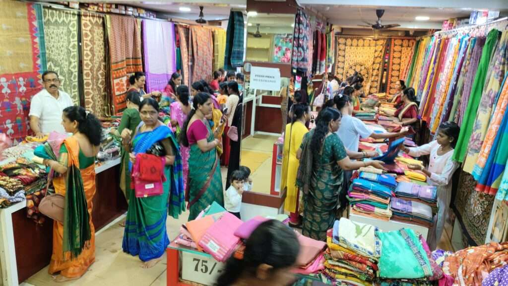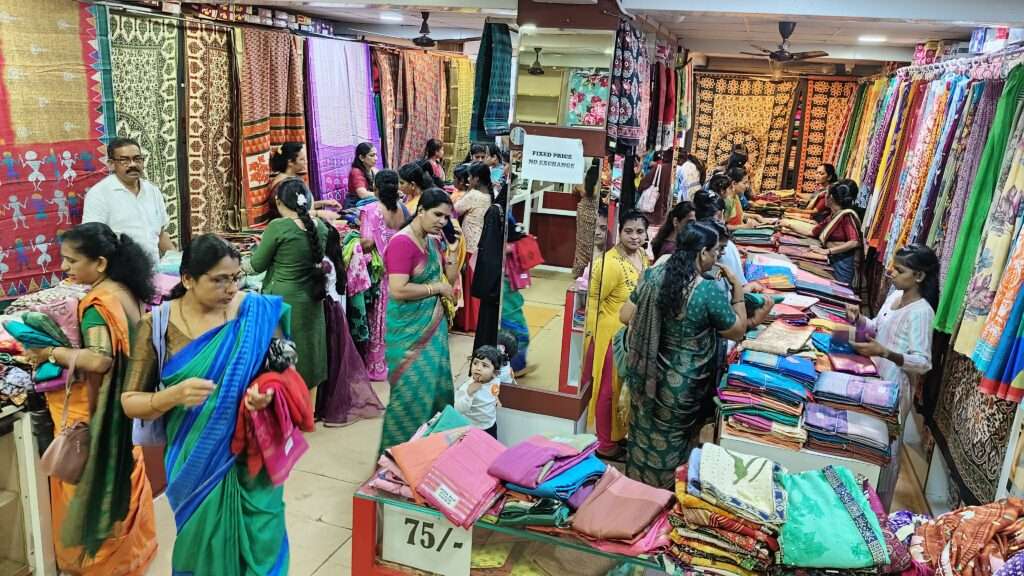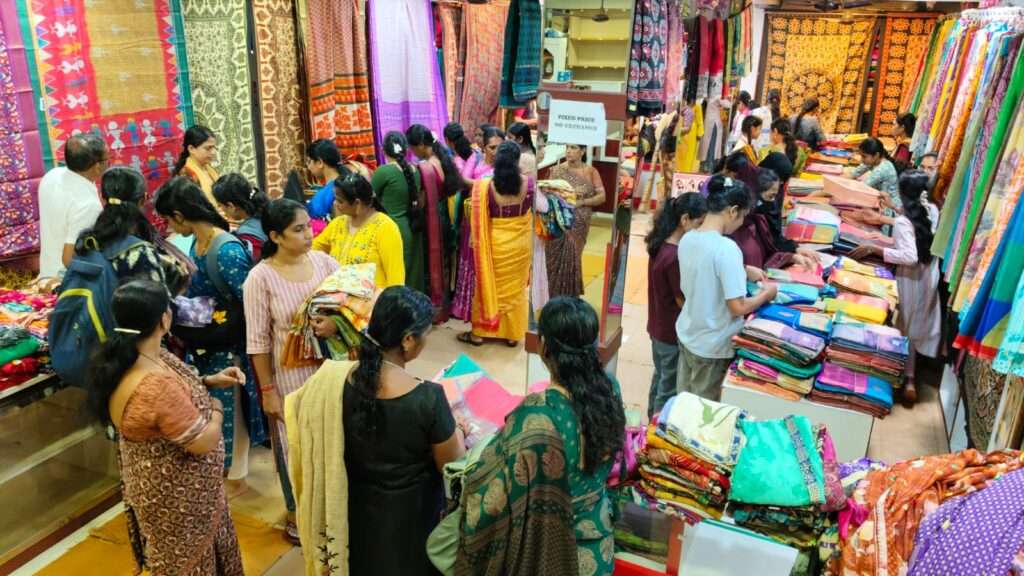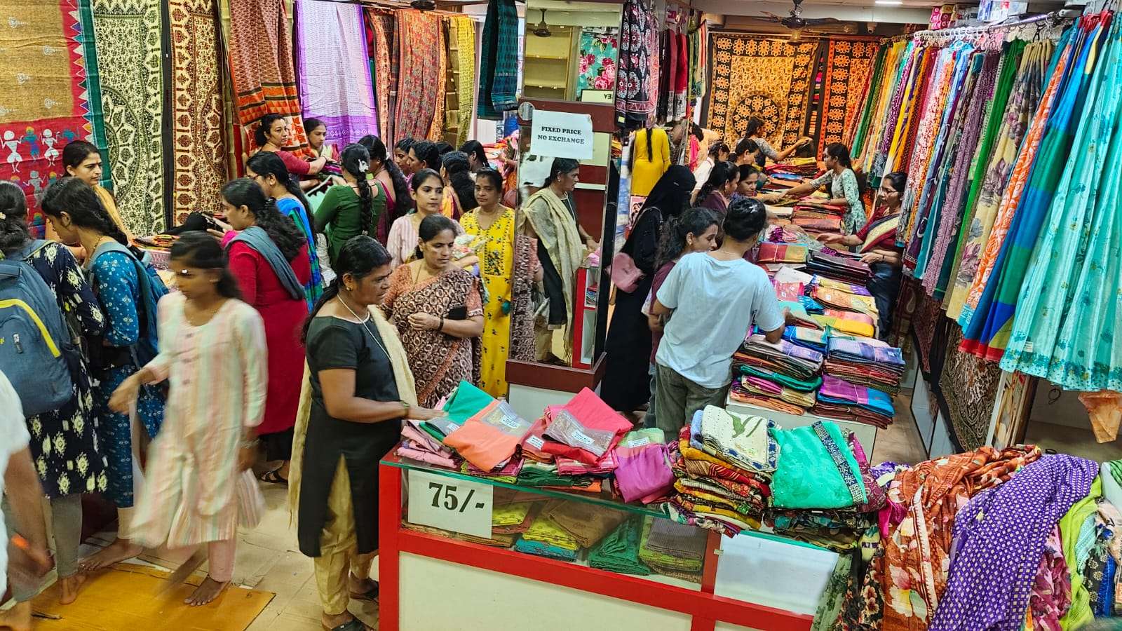 ವಿವಿಧ ವೆರೈಟಿಯ ಸೀರೆಗಳನ್ನು ಖರೀದಿಸುತ್ತಿರುವ ಗ್ರಾಹಕರು