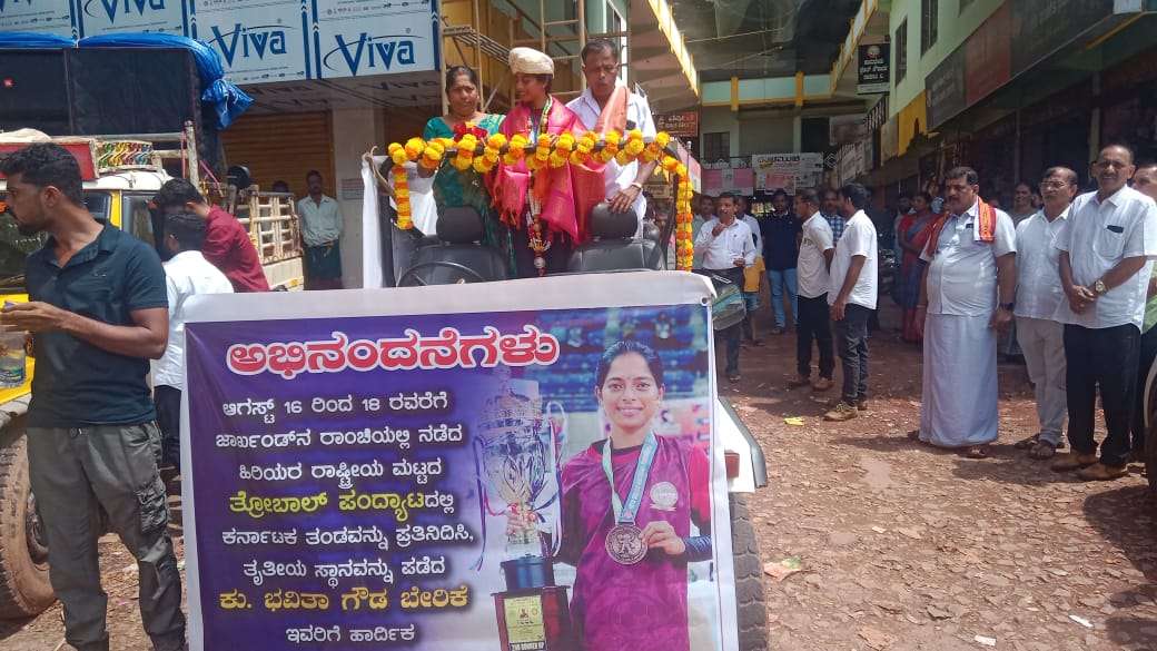 ಝಾರ್ಖಂಡ್ ರಾಂಚಿಯಲ್ಲಿ ಜರುಗಿದ ರಾಷ್ಟ್ರಮಟ್ಟದ ತ್ರೋಬಾಲ್ ಪಂದ್ಯಾಟದಲ್ಲಿ ಕರ್ನಾಟಕ ರಾಜ್ಯವನ್ನು ಪ್ರತಿನಿಧಿಸಿ ತೃತೀಯ ಸ್ಥಾನವನ್ನು ಗಳಿಸಿದ ಕಳಂಜ ಗ್ರಾಮದ ಕು|ಭವಿತಾ ಗೌಡ ಬೇರಿಕೆಯವರಿಗೆ ಸಾರ್ವಜನಿಕ ಅಭಿನಂದನಾ ಕಾರ್ಯಕ್ರಮ ಮೆರವಣಿಗೆ ಮೂಲಕ ಆ.24ರಂದು ನಡೆಸಲಾಯಿತು.