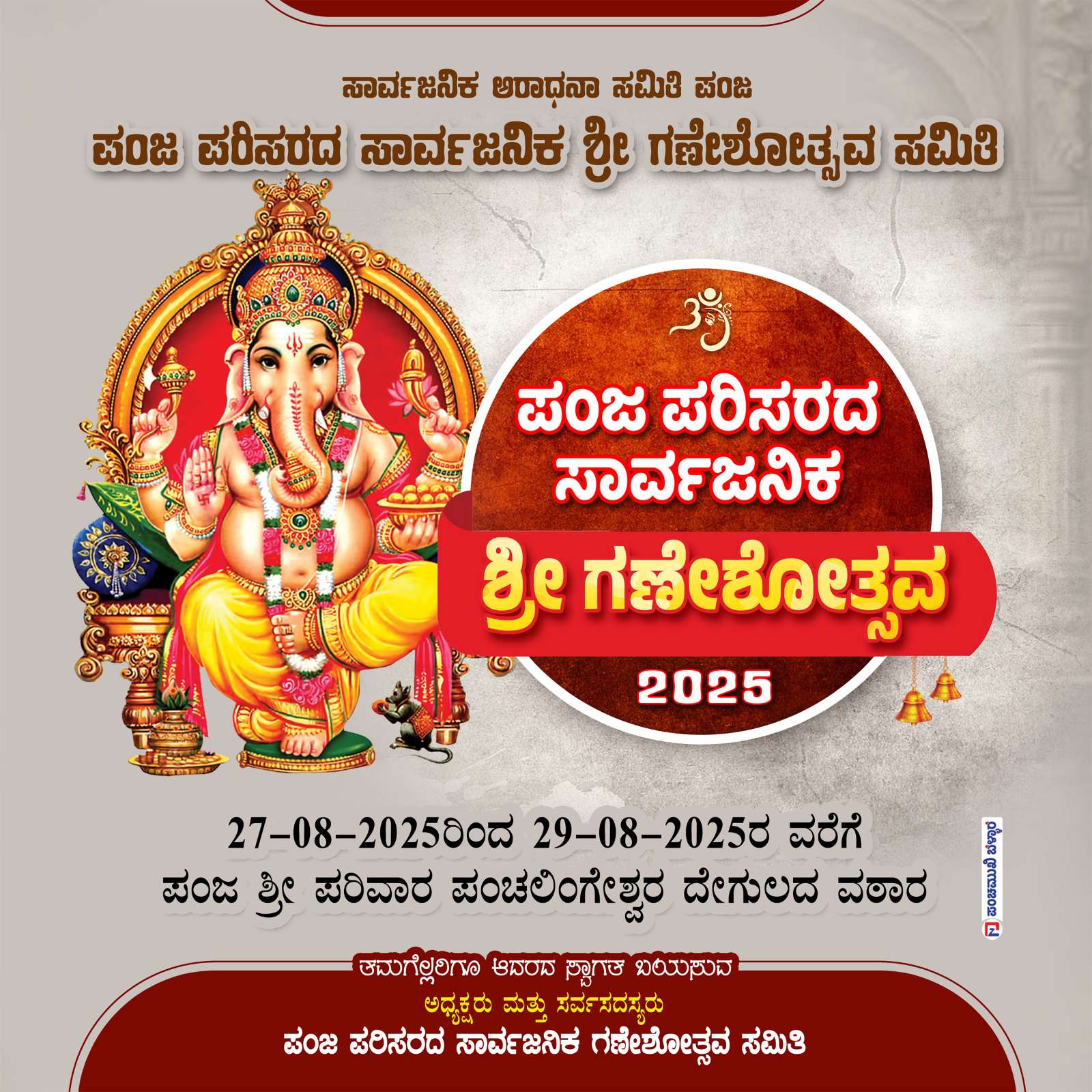 ಸಾರ್ವಜನಿಕ ಆರಾಧನಾ ಸಮಿತಿ ಪಂಜ,ಪಂಜ ಪರಿಸರದ ಸಾರ್ವಜನಿಕ ಶ್ರೀ ಗಣೇಶೋತ್ಸವ ಸಮಿತಿ-2025 ಇದರ ವತಿಯಿಂದ ಪಂಜ ಪರಿಸರದ ಸಾರ್ವಜನಿಕ ಶ್ರೀ ಗಣೇಶೋತ್ಸವ ಆ.27 ರಿಂದ ಆ.29 ತನಕ ಶ್ರೀ ಪರಿವಾರ ಪಂಚಲಿಂಗೇಶ್ವರ ದೇಗುಲದ ವಠಾರದಲ್ಲಿ ವಿಜೃಂಭಣೆಯಿಂದ ಜರುಗಲಿದೆ.