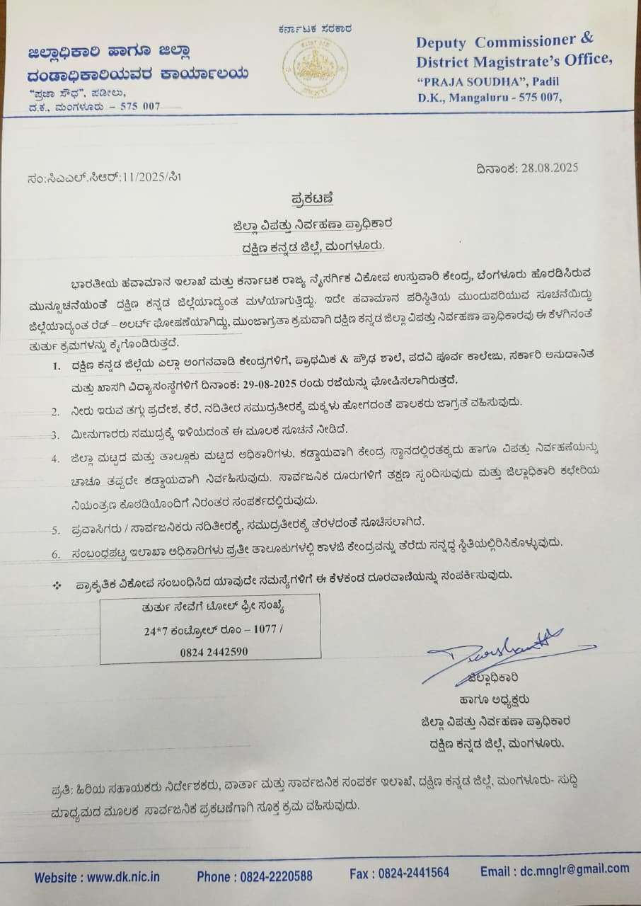 ಭಾರಿ ಮಳೆ ಹಿನ್ನೆಲೆ; ಆ.29 ರಂದು ದ.ಕ. ಶಾಲೆ, ಪಿಯು ಕಾಲೇಜುಗಳಿಗೆ ರಜೆ