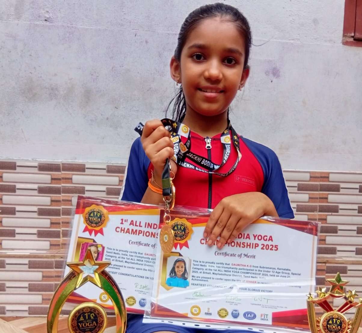 ತಮಿಳುನಾಡಿನ ಮೈಲಾಡುತುರೈ ಜಿಲ್ಲೆಯ ಸಿರ್ಕಾಲಿಯಲ್ಲಿ ಜೂ. 21 ರಂದು ನಡೆದ 1ನೆ ಅಖಿಲ ಭಾರತ ಯೋಗ ಚಾಂಪಿಯನ್ ಶಿಪ್ 2025ರ 12ವರ್ಷದೊಳಗಿನ ವಯೋಮಾನದ ಗುಂಪಿನಲ್ಲಿ ಸಾಮಾನ್ಯ ವಿಭಾಗದಲ್ಲಿ ಗೌರಿತಾ ಕೆ.ಜಿ. ದ್ವಿತೀಯ ಸ್ಥಾನ ಪಡೆದಿರುತ್ತಾರೆ.