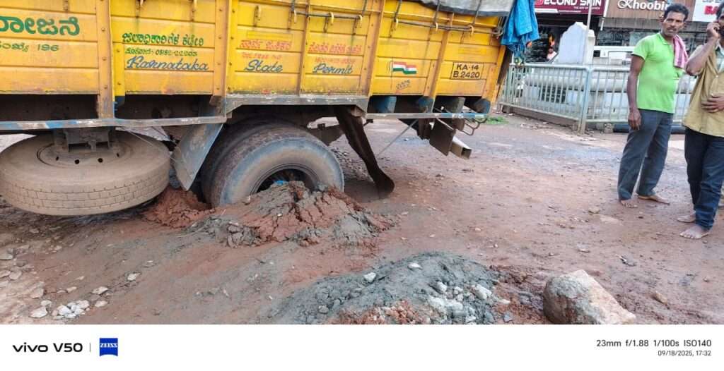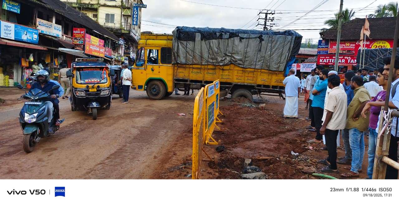 ಸುಳ್ಯ ಪೊಲೀಸ್ ಠಾಣೆಯ ಮುಂಭಾಗದಲ್ಲಿ ಚೆನ್ನಕೇಶವ ದೇವಸ್ಥಾನಕ್ಕೆ ತಿರುಗುವ ಜಂಕ್ಷನ್ನಲ್ಲಿ ಲಾರಿಯ ಚಕ್ರವೊಂದು ಹೂತುಹೋಗಿದ್ದು, ವಾಹನ ಸಂಚಾರಕ್ಕೆ ಅಡ್ಡಿಯಾಗಿದೆ.