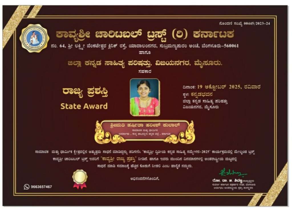ಲೇಖಕಿ, ಹವ್ಯಾಸಿ ಬರಹಗಾರ್ತಿ, ಕವಯತ್ರಿ, ಧಾರ್ಮಿಕ, ಸಾಮಾಜಿಕ ಹಾಗೂ ಸಂಘ ಸಂಸ್ಥೆಗಳಲ್ಲಿ ತೊಡಗಿಸಿಕೊಂಡಿರುವ ಹರ್ಷಿತಾ ಹರೀಶ್ ಕುಲಾಲ್ ಐವರ್ನಾಡು ಇವರು ಕಾವ್ಯ ಶ್ರೀ ರಾಜ್ಯ ಪ್ರಶಸ್ತಿಗೆ ಆಯ್ಕೆಯಾಗಿದ್ದಾರೆ.