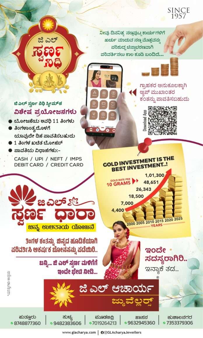 ಸುಳ್ಯ: ಪುತ್ತೂರಿನ ಖ್ಯಾತ ಚಿನ್ನಾಭರಣಗಳ ಮಳಿಗೆ ಜಿಎಲ್ ಆಚಾರ್ಯ ಜ್ಯುವೆಲ್ಲರ್ಸ್ ಗ್ರಾಹಕರಿಗೆ ವಿಶೇಷ ಕೊಡುಗೆ ನೀಡುತ್ತಿದ್ದು, ಜಿಎಲ್ ಸ್ವರ್ಣ ನಿಧಿ ಹಾಗೂ ಸ್ವರ್ಣ ಧಾರಾ ಯೋಜನೆ ರೂಪಿಸಿದೆ.