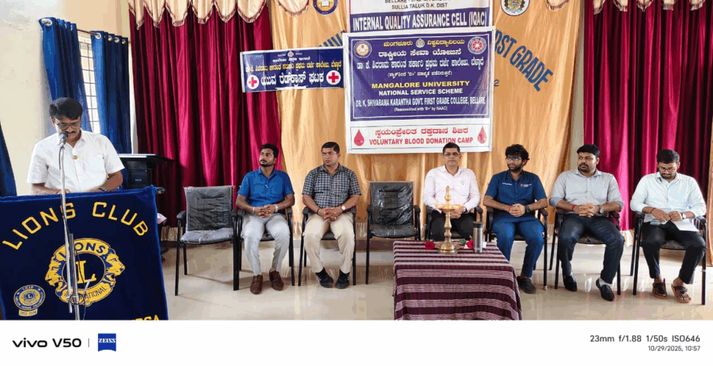 ಡಾ. ಶಿವರಾಮ ಕಾರಂತ ಪ್ರಥಮ ದರ್ಜೆ ಕಾಲೇಜು ಬೆಳ್ಳಾರೆ, ರಾಷ್ಟ್ರೀಯ ಸೇವಾ ಯೋಜನೆ ಮತ್ತು ಯುವ ರೆಡ್ ಕ್ರಾಸ್ ಸಂಸ್ಥೆ, ಲಯನ್ಸ್ ಕ್ಲಬ್ ಬೆಳ್ಳಾರೆ ಜಲದುರ್ಗ, ಕಾಲೇಜಿನ ಹಿರಿಯ ವಿದ್ಯಾರ್ಥಿ ಸಂಘ ಮತ್ತು ವೆನ್ ಲಾಕ್ ಆಸ್ಪತ್ರೆ ಮಂಗಳೂರು ಇವುಗಳ ಸಂಯುಕ್ತ ಆಶ್ರಯದಲ್ಲಿ ಸ್ವಯಂ ಪ್ರೇರಿತ ರಕ್ತದಾನ ಶಿಬಿರ ಅ. 29ರಂದು ಕಾಲೇಜಿನ ಆವರಣದಲ್ಲಿ ನಡೆಯಿತು.