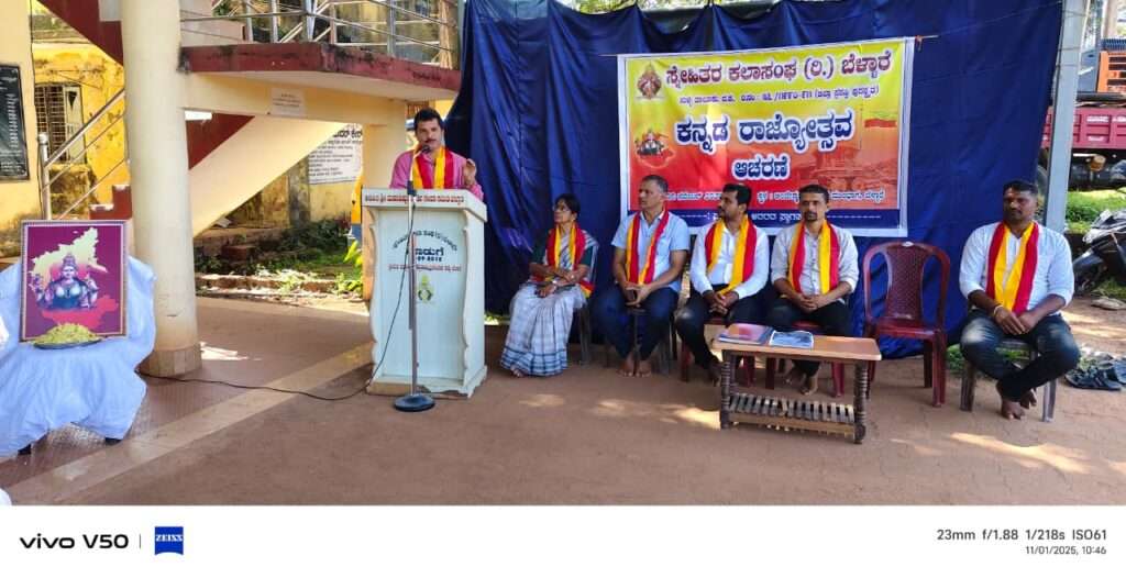 ಸ್ನೇಹಿತರ ಕಲಾ ಸಂಘ ಬೆಳ್ಳಾರೆ ಆಶ್ರಯದಲ್ಲಿ ಕನ್ನಡ ರಾಜ್ಯೋತ್ಸವ ಕಾರ್ಯಕ್ರಮ ಬೆಳ್ಳಾರೆ ಅಂಬೇಡ್ಕರ್ ಭವನದ ಮುಂಭಾಗದಲ್ಲಿ ನ. 01 ರಂದು ಜರುಗಿತು. ಕಾರ್ಯಕ್ರಮದಲ್ಲಿ ಬೆಳ್ಳಾರೆ ಜ್ಞಾನದೀಪ ಶಿಕ್ಷಣ ಸಂಸ್ಥೆಯ ನಿರ್ದೇಶಕ ಉಮೇಶ್ ಮಣಿಕ್ಕಾರ ಧ್ವಜಾರೋಹಣ ನೆರವೇರಿಸಿ ಶುಭ ಹಾರೈಸಿದರು. ಬೆಳ್ಳಾರೆ ಸ್ನೇಹಿತರ ಕಲಾ ಸಂಘದ ಅಧ್ಯಕ್ಷರಾದ ವಸಂತ ಗೌಡ ಪಡ್ಪು ಅಧ್ಯಕ್ಷತೆ ವಹಿಸಿದ್ದರು.