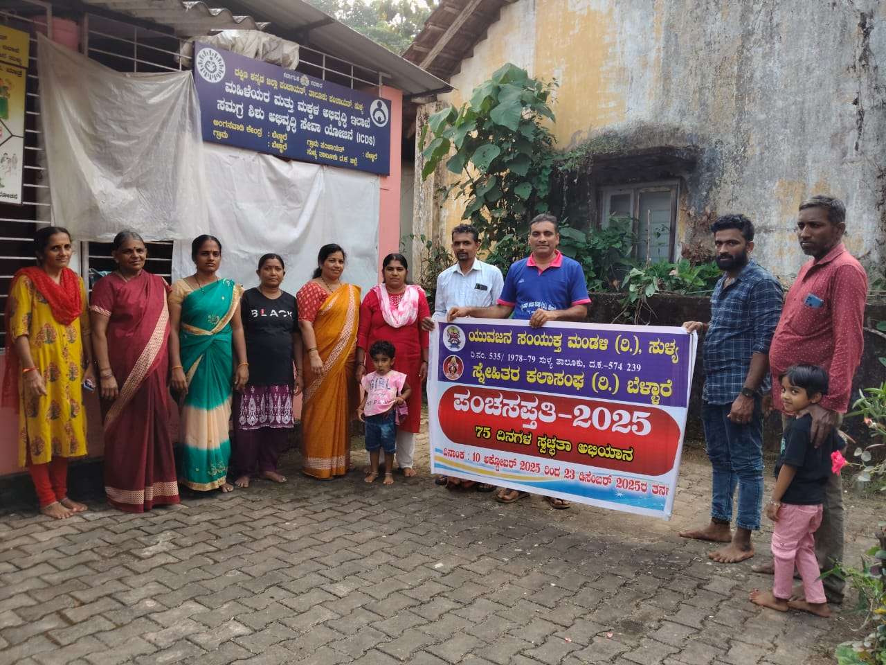 ಬೆಳ್ಳಾರೆಯಲ್ಲಿ ಸ್ನೇಹಿತರ ಕಲಾಸಂಘದ ಆಶ್ರಯದಲ್ಲಿ ಪಂಚ ಸಪ್ತತಿ 2025 ಸ್ವಚ್ಛತಾ ಕಾರ್ಯಕ್ರಮ November 14, 2025 0 FacebookTwitterWhatsApp ಸುಳ್ಯ ತಾಲೂಕು ಯುವಜನ ಸಂಯುಕ್ತ ಮಂಡಳಿ ಮತ್ತು ಸ್ನೇಹಿತರ ಕಲಾ ಸಂಘ ಬೆಳ್ಳಾರೆ ಇದರ ಆಶ್ರಯದಲ್ಲಿ 75 ದಿನಗಳ ಸ್ವಚ್ಛತಾ ಅಭಿಯಾನ ಪಂಚ ಸಪ್ತತಿ 2025 ಅಂಗವಾಗಿ ನಮ್ಮ ನಡಿಗೆ ಸ್ವಚ್ಛತೆಯಡೆಗೆ ಸ್ವಚ್ಛತಾ ಕಾರ್ಯಕ್ರಮ ನ. 12ರಂದು ಬೆಳ್ಳಾರೆ ಅಂಗನವಾಡಿ ಕೇಂದ್ರದಲ್ಲಿ ನಡೆಸಲಾಯಿತು.