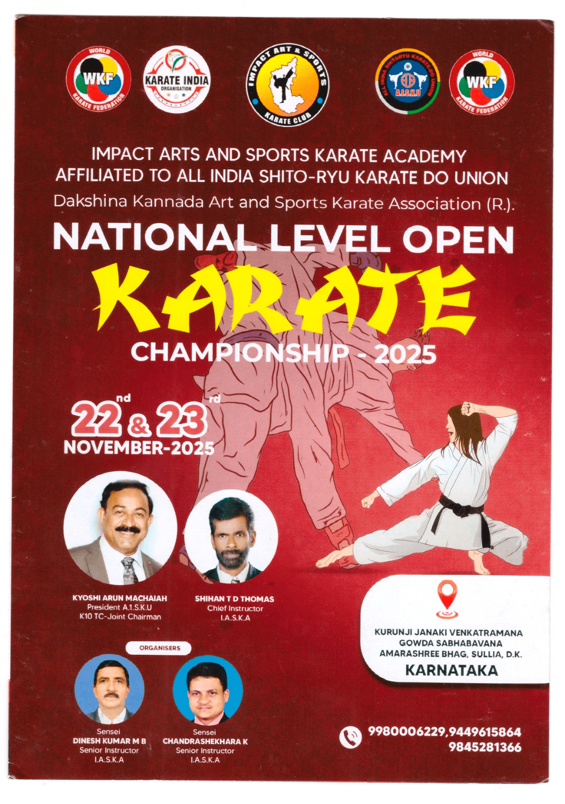 ಆಲ್ ಇಂಡಿಯಾ ಶಿಟೋ-ರಿಯೂ ಕರಾಟೆ ಡು ಯೂನಿಯನ್ ಇದರಿಂದ ಮಾನ್ಯತೆ ಪಡೆದ ಇಂಪೇಕ್ಟ್ ಆರ್ಟ್ಸ್ ಮತ್ತು ಸ್ಪೋರ್ಟ್ಸ್ ಕರಾಟೆ ಅಕಾಡೆಮಿ ದ.ಕ. ಆರ್ಟ್ಸ್ ಮತ್ತು ಸ್ಪೋರ್ಟ್ಸ್ ಕರಾಟೆ ಅಸೋಸಿಯೇಷನ್ ಇದರ ಆಶ್ರಯದಲ್ಲಿ ನ್ಯಾಷನಲ್ ಲೆವೆಲ್ ಓಪನ್ ಕರಾಟೆ ಚಾಂಪಿಯನ್ಶಿಪ್-2025 ನವೆಂಬರ್ 22 ಮತ್ತು 23 ರಂದು ಸುಳ್ಯದ ಕುರುಂಜಿ ಜಾನಕಿ ವೆಂಕಟ್ರಮಣ ಗೌಡ ಸಭಾಭವನದಲ್ಲಿ ನಡೆಯಲಿದೆ.