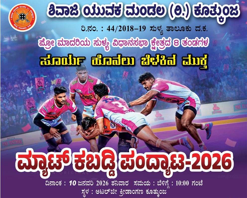 ಶಿವಾಜಿ ಯುವಕ ಮಂಡಲ (ರಿ.) ಕೂತ್ಕುಂಜ ಇದರ ವತಿಯಿಂದ ಪ್ರೋ ಮಾದರಿಯ ಸುಳ್ಯ ವಿಧಾನಸಭಾ ಕ್ಷೇತ್ರದ 8 ತಂಡಗಳ ಸೂರ್ಯ ಹೊನಲು ಬೆಳಕಿನ ಮುಕ್ತ ಮ್ಯಾಟ್ ಕಬಡ್ಡಿ ಪಂದ್ಯಾಟ-2026 ಜ 10 ರಂದು ಕೂತ್ಕುಂಜ ಅಟಲ್ ಜೀ ಕ್ರೀಡಾಂಗಣದಲ್ಲಿ ನಡೆಯಲಿದೆ.