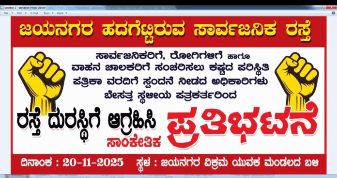 ಜಯನಗರ ಹದಗೆಟ್ಟಿರುವ ಸಾರ್ವಜನಿಕ ರಸ್ತೆ ದುರಸ್ಥಿಯಾಗಿದ್ದು ಸಾರ್ವಜನಿಕರಿಗೆ, ರೋಗಿಗಳಿಗೆ ಹಾಗೂ ವಾಹನ ಚಾಲಕರಿಗೆ ಸಂಚರಿಸಲು ಕಷ್ಟದ ಪರಿಸ್ಥಿತಿಯ ಕಾರಣ ಪತ್ರಿಕಾ ವರದಿ ಮಾಡಲಾಗಿತ್ತು. ಈ ವರದಿಗೆ ಆದಿಕಾರಿಗಳು ಸ್ಪಂದನೆ ನೀಡಿಲ್ಲ. ಇದರಿಂದ ಬೇಸೆತ್ತ ಸ್ಥಳೀಯ ಪತ್ರಕರ್ತರು ಆಗ್ರಹಿಸಿ ನ.20ರಂದು ಜಯನಗರ ವಿಕ್ರಮ ಯುವಕ ಮಂಡಲ ಬಳಿ ಪ್ರತಿಭಟನೆ ನಡೆಸಿದರು.
