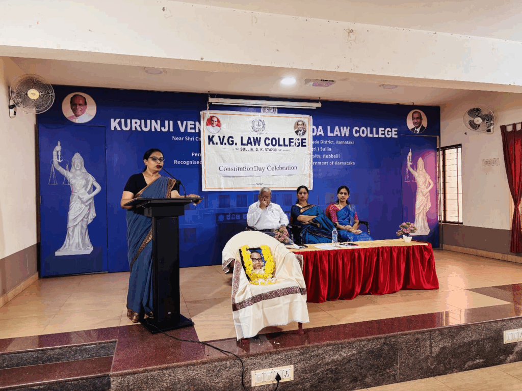 ಕೆ.ವಿ.ಜಿ ಕಾನೂನು ಮಹಾವಿದ್ಯಾಲಯದಲ್ಲಿ ಸಂವಿಧಾನ ದಿನವನ್ನು ನ. 27 ರಂದು ಆಚರಿಸಲಾಯಿತು. ಕಾರ್ಯಕ್ರಮದ ಅಧ್ಯಕ್ಷತೆಯನ್ನು ಕಾಲೇಜಿನ ಪ್ರಾಂಶುಪಾಲೆ ಪ್ರೊ. ಟೀನಾ ಎಚ್.ಎಸ್ ವಹಿಸಿದ್ದರು. ಸಂಪನ್ಮೂಲ ವ್ಯಕ್ತಿಗಳಾದ ಕಾಲೇಜಿನ ಉಪನ್ಯಾಸಕಿ ಸುಚಿತ್ರ ಜೆ, ಸಾಂವಿಧಾನಿಕ ನೈತಿಕತೆಯ (Constitutional Morality) ಪರಿಕಲ್ಪನೆ, ಅದರ ಐತಿಹಾಸಿಕ ಬೇರುಗಳು, ಭಾರತೀಯ ನ್ಯಾಯಶಾಸ್ತ್ರದಲ್ಲಿ ಅದರ ವಿಕಾಸ, ಮತ್ತು ವಿಶೇಷವಾಗಿ ಧರ್ಮದ ಮೂಲಭೂತ ಹಕ್ಕಿಗೆ ಸಂಬಂಧಿಸಿದಂತೆ ಸಾಂವಿಧಾನಿಕ ನೈತಿಕತೆಯು ಹೇಗೆ ಅನ್ವಯಿಸುತ್ತದೆ ಎಂಬುದನ್ನು ವಿಶ್ಲೇಷಿಸಿದರು.
