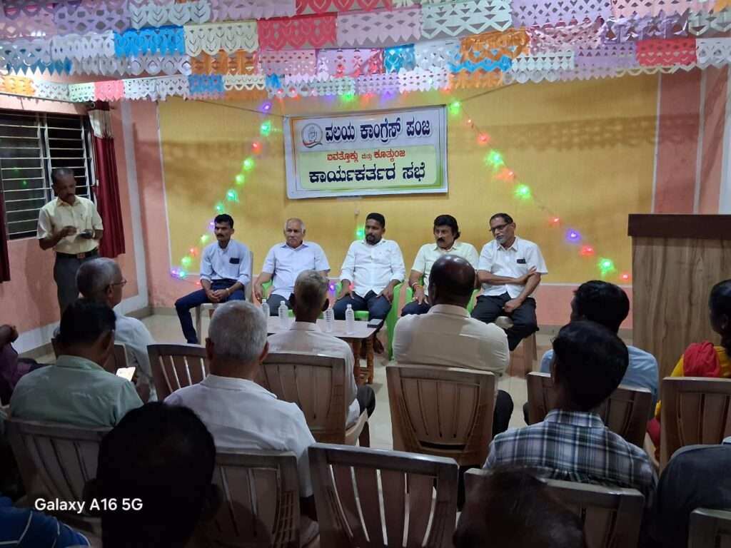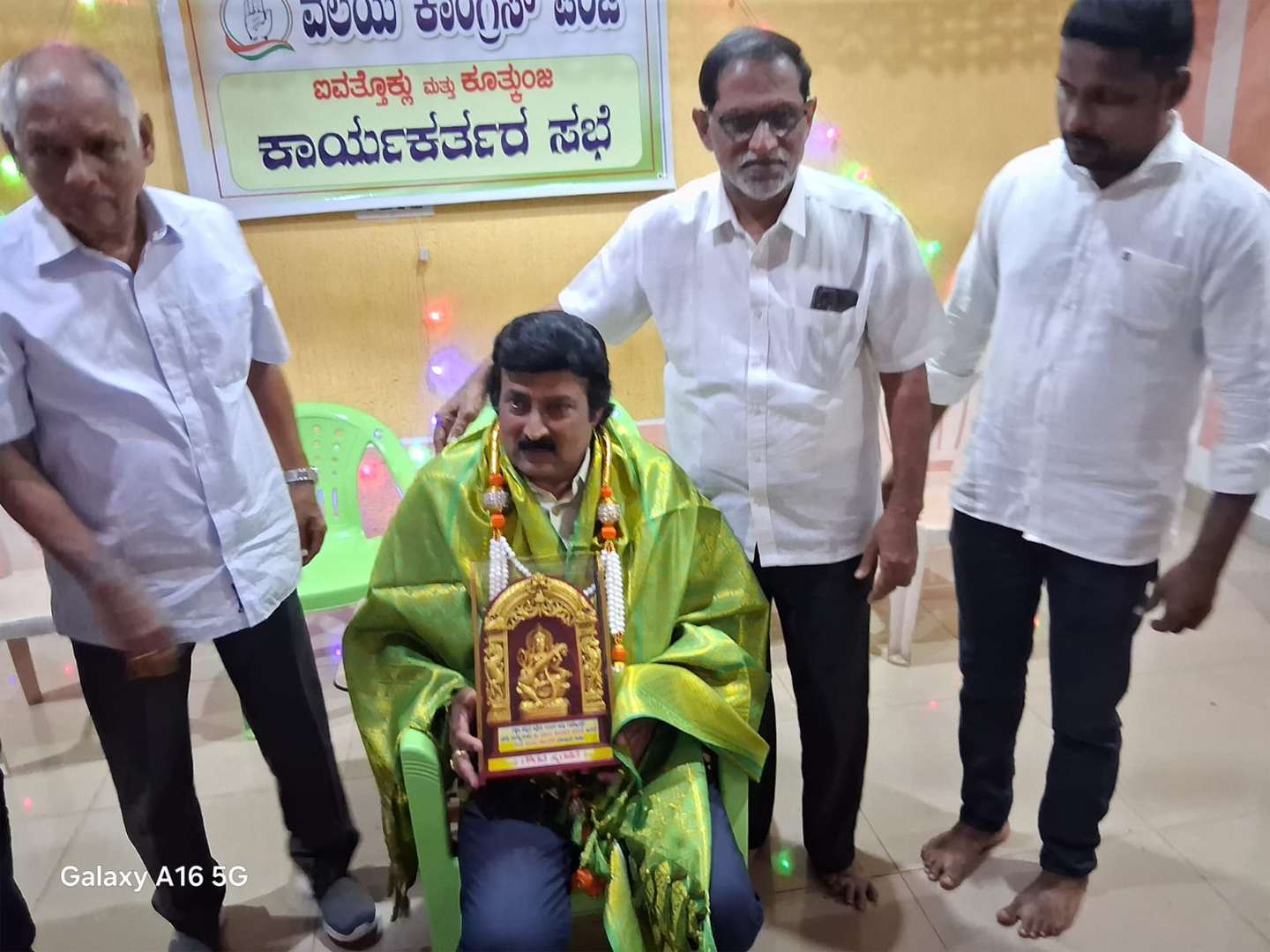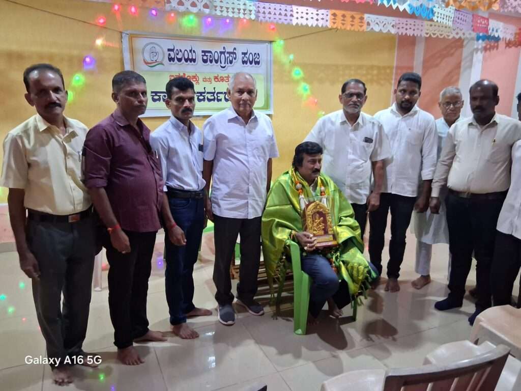 ಪಂಜ ವಲಯ ಕಾಂಗ್ರೆಸ್ ಪಕ್ಷದ ಕಾರ್ಯಕರ್ತರ ಸಭೆ ಪಂಜ ವಿ.ಕೆ.ರೆಸಿಡೆನ್ಸಿ ಸಭಾಂಗಣದಲ್ಲಿ ನಡೆಯಿತು. ಈ ಸಂದರ್ಭದಲ್ಲಿ ಕೃಷಿ ಕ್ಷೇತ್ರದಲ್ಲಿನ ಅಭೂತಪೂರ್ವ ಸಾಧನೆಗಾಗಿ 2025ನೇ ಸಾಲಿನ ಜಿಲ್ಲಾ ರಾಜ್ಯೋತ್ಸವ ಪ್ರಶಸ್ತಿ ಪಡೆದಿರುವ ವಿಜಯಕುಮಾರ್ ಸೊರಕೆ ಯವರನ್ನು ಸನ್ಮಾನಿಸಿ ಗೌರವಿಸಲಾಯಿತು. ಸಮಾರಂಭದ ಅಧ್ಯಕ್ಷತೆಯನ್ನು ಕಾಂಗ್ರೆಸ್ ಪಕ್ಷದ ಪಂಜ ವಲಯ ಸಮಿತಿಯ ಅಧ್ಯಕ್ಷ ಕುಸುಮಾಧರ ಕೆರೆಯಡ್ಕ ವಹಿಸಿದ್ದರು. ಮುಖ್ಯ ಅತಿಥಿಗಳಾಗಿ ಉಪಸ್ಥಿತರಿದ್ದ ಪಂಜದ ಹಿರಿಯ ಕಾಂಗ್ರೆಸ್ ನಾಯಕ ಶ್ರೇಯಂಸ್ ಕುಮಾರ್ ಶೆಟ್ಟಿಮೂಲೆ ಸನ್ಮಾನ ಕಾರ್ಯಕ್ರಮವನ್ನು ನೆರವೇರಿಸಿದರು.