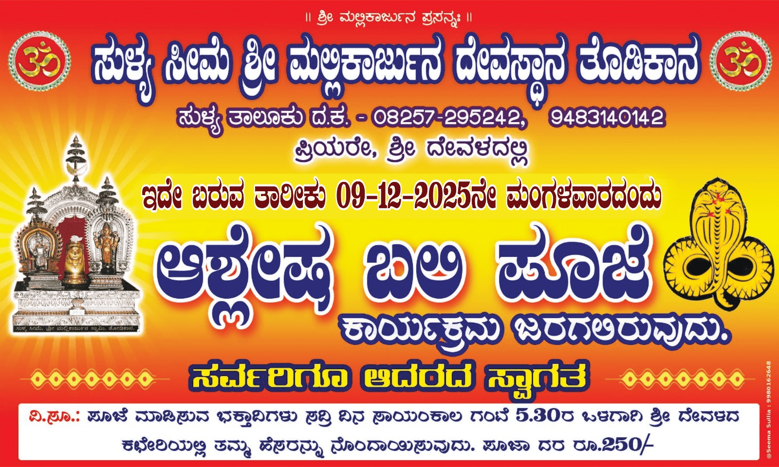 ಸುಳ್ಯ ಸೀಮೆ ಶ್ರೀ ಮಲ್ಲಿಕಾರ್ಜುನ ದೇವಸ್ಥಾನ ತೊಡಿಕಾನದಲ್ಲಿ ಡಿ. ೦9 ಮಂಗಳವಾರದಂದು ಆಶ್ಲೇಷ ಬಲಿ ಪೂಜೆ ಕಾರ್ಯಕ್ರಮ ಜರಗಲಿರುವುದು.