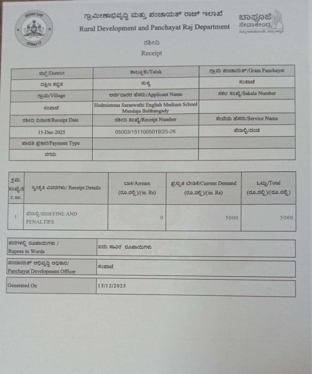 ಸಂಪಾಜೆ ಪಂಚಾಯತ್ ಗೆ ಬರಬೇಕಿತ್ತು. ಅವರು ಬಾರದಿದ್ದುದನ್ನು ಕಂಡ ಪಂಚಾಯತ್ ನವರು ಆ ಶಾಲೆಗೆ ಫೋನ್ ಮಾಡಿದರೆನ್ನಲಾಗಿದೆ. ಪರಿಣಾಮವಾಗಿ ಶಾಲೆಯವರು, ಪಂಚಾಯತ್ ಕಳುಹಿಸಿಕೊಟ್ಟಿದ್ದ ಕ್ಯೂಆರ್ ಕೋಡ್ ಗೆ ರೂ. 5000 ದಂಡದ ರೂಪದಲ್ಲಿ ಹಾಕಿದ್ದಾರೆಂದು ಸಂಪಾಜೆ ಗ್ರಾ.ಪಂ. ಪಿ.ಡಿ.ಒ. ಸರಿಟಾ ಓಲ್ಗಾ ಡಿಸೋಜ ತಿಳಿಸಿದ್ದಾರೆ.ಪಂಚಾಯಿತಿಯವರು ದಂಡ ಪಾವತಿ ರಸಿದಿಯನ್ನು ಶಾಲೆಯವರಿಗೆ ವಾಟ್ಸಾಪ್ನಲ್ಲಿ ಕಳುಹಿಸಿದ್ದಾರೆ.