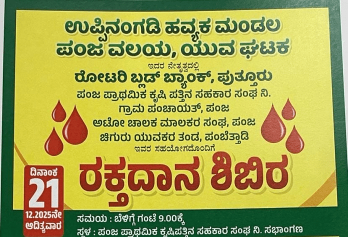 ಇದರ ನೇತೃತ್ವದಲ್ಲಿ ರೋಟರಿ ಬ್ಲಡ್ ಬ್ಯಾಂಕ್ ಪುತ್ತೂರು, ಪಂಜ ಪ್ರಾಥಮಿಕ ಕೃಷಿ ಪತ್ತಿನ ಸಹಕಾರ ಸಂಘ ನಿ.,ಗ್ರಾಮ ಪಂಚಾಯತ್ ಪಂಜ, ಅಟೋ ಚಾಲಕ ಮಾಲಕರ ಸಂಘ ಪಂಜ ,ಚಿಗುರು ಗೆಳೆಯರ ಬಳಗ, ಪಂಬೆತ್ತಾಡಿ ಇವರ ಸಹಯೋಗದೊಂದಿಗೆ ಡಿ.21 ರಂದು ರಕ್ತದಾನ ಶಿಬಿರ ಬೆಳಿಗ್ಗೆ ಗಂಟೆ 9.00ಕ್ಕೆ ಪಂಜ ಪ್ರಾಥಮಿಕ ಕೃಷಿ ಪತ್ತಿನ ಸಹಕಾರ ಸಂಘ ನಿ. ಸಭಾಂಗಣದಲ್ಲಿ ನಡೆಯಲಿದೆ. ಎಂದು ಪ್ರಕಟಣೆಯಲ್ಲಿ ತಿಳಿಸಿದ್ದಾರೆ.