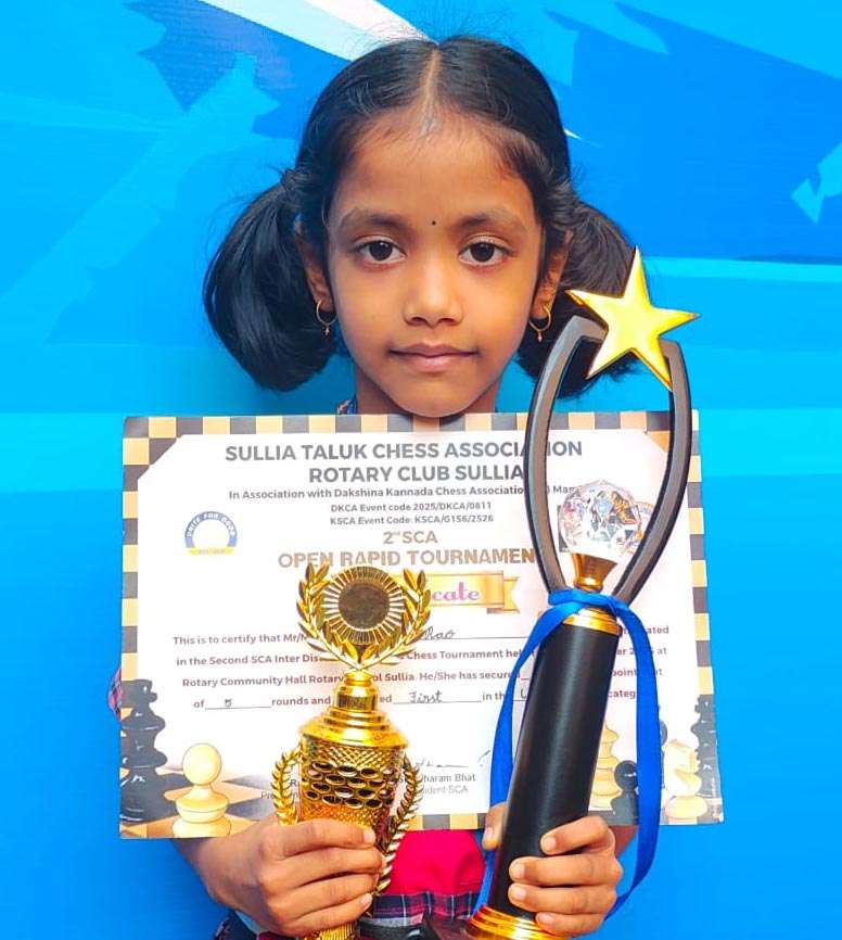 ಕೆವಿಜಿ ಇಂಟರ್ ನ್ಯಾಷನಲ್ ಪಬ್ಲಿಕ್ ಶಾಲೆಯ ಯುಕೆಜಿಯ ವಿದ್ಯಾರ್ಥಿನಿ ಲಹರಿ ರಾವ್, ಸುಳ್ಯ ತಾಲೂಕು ಚೆಸ್ ಅಸೋಸಿಯೇಷನ್ – ರೋಟರಿ ಕ್ಲಬ್ ಸುಳ್ಯ, ಇವರು ನಡೆಸಿದ ತಾಲೂಕು ಮಟ್ಟದ ಚೆಸ್ ಸ್ಪರ್ಧೆಯಲ್ಲಿ ಏಳು ವರ್ಷದ ಒಳಗಿನ ವಯೋಮಾನದ ವಿಭಾಗದಲ್ಲಿ ಲಹರಿ ರಾವ್ ಪ್ರಥಮ ಸ್ಥಾನ ಪಡೆದಿದ್ದಾರೆ.